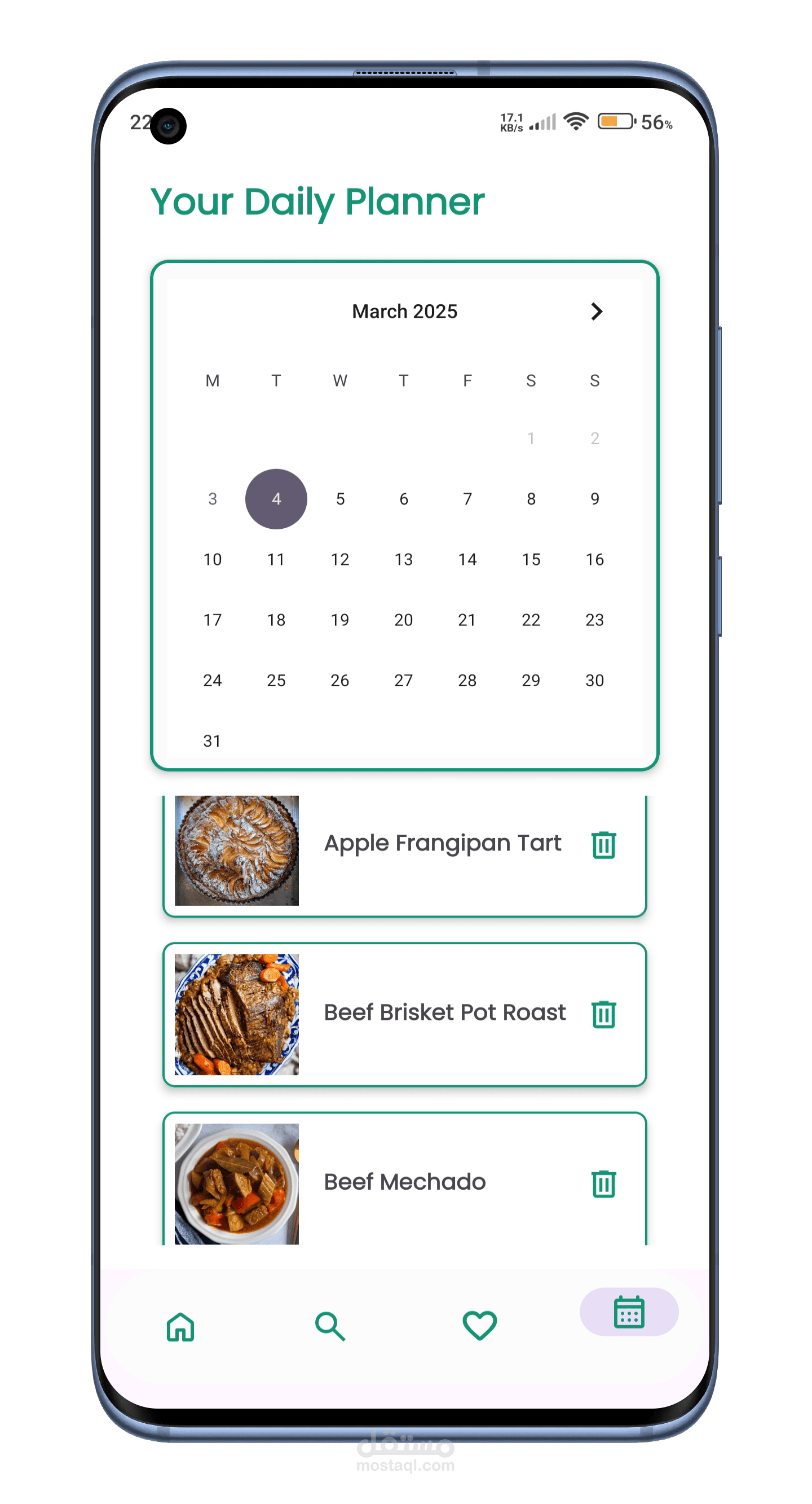 دعم تخطيط الوجبات من خلال إضافتها إلى التقويم اليومي أو الأسبوعي.