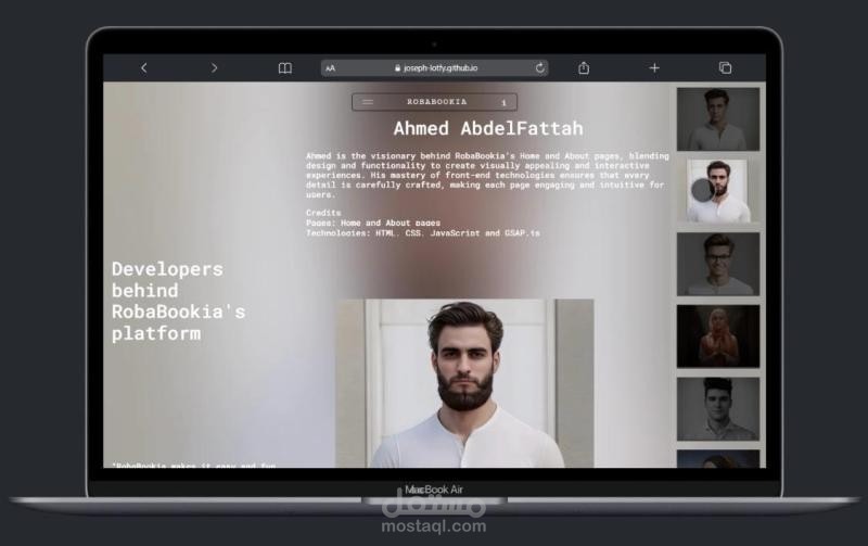 Ahmed plays a pivotal role in bringing the Home, About, and loading pages of RobaBookia to life. With expertise in HTML, CSS, JavaScript, Tailwind CSS and GSAP.js.
