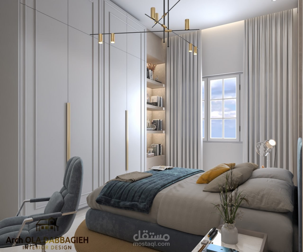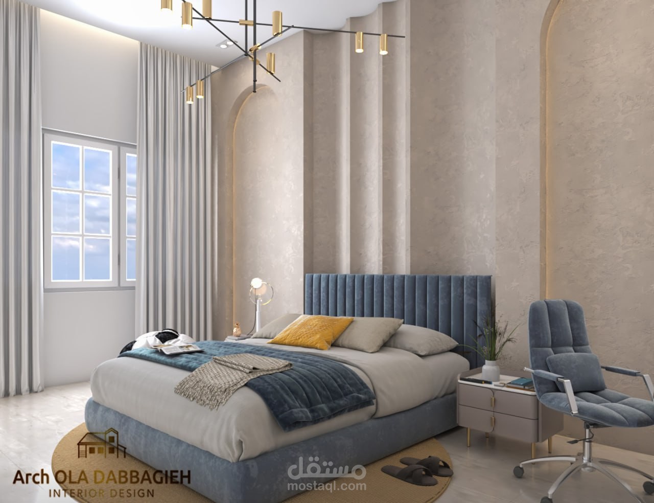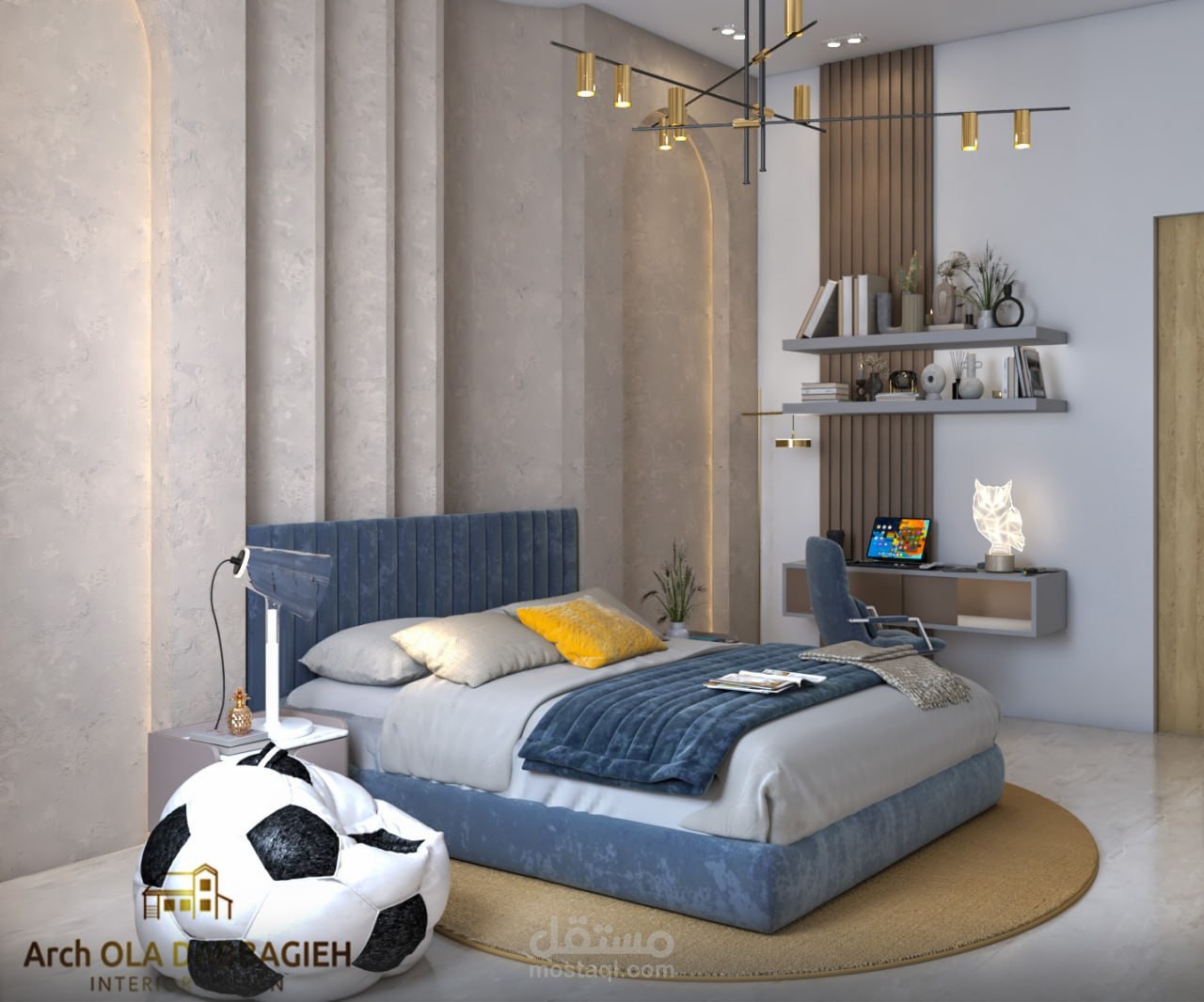 غرفة نوم عصرية لشاب يافع تم دمج عنصر الحداثة مع الأقواس ومواد الإكساء القوية
