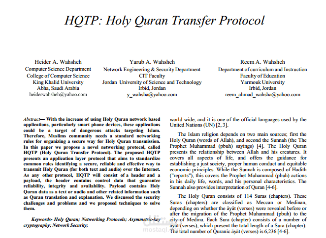 بحث علمي يعرض بوتوكول شبكات لنقل القرآن الكريم بالصوت والنص بشكل آمن عبر شبكة الانترنت .. تم نشره في مؤتمر جامعة طيبة الدولي في توظيف تقنية المعلومات لخدمة القرآن الكريم في المدينة المنورة عام 2013