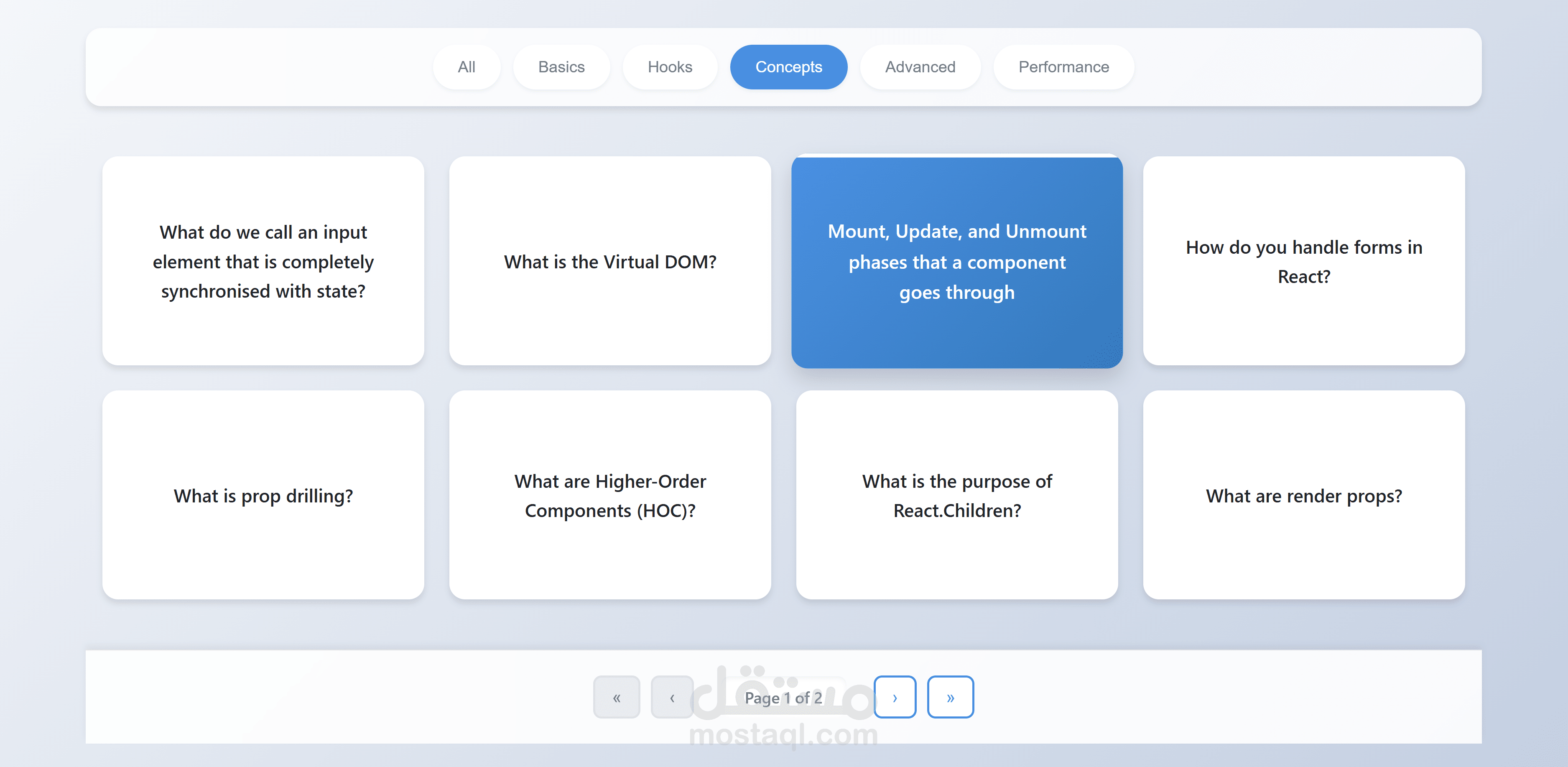 A modern, interactive flashcards application built with React for studying React concepts and web development topics. The app features a clean, intuitive interface with smooth animations and a responsive design.