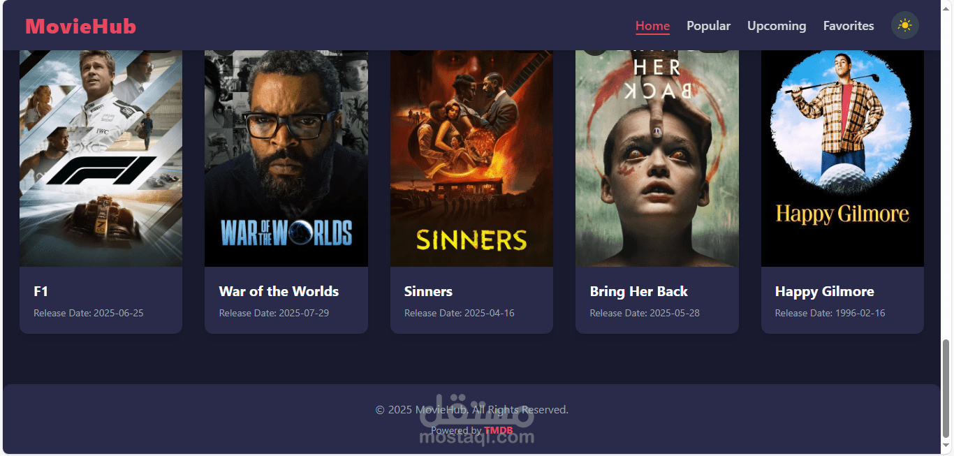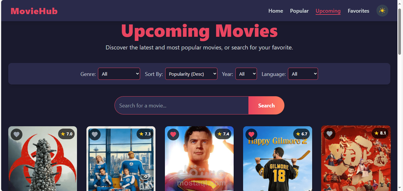 Interactive Navigation: The application features a clear navigation bar with links to different sections, such as "Home," "Popular," "Upcoming," and a