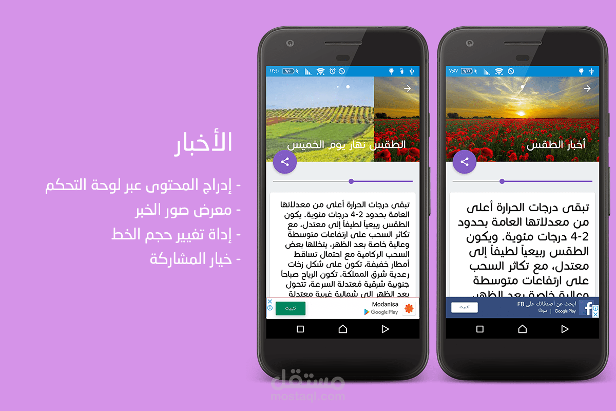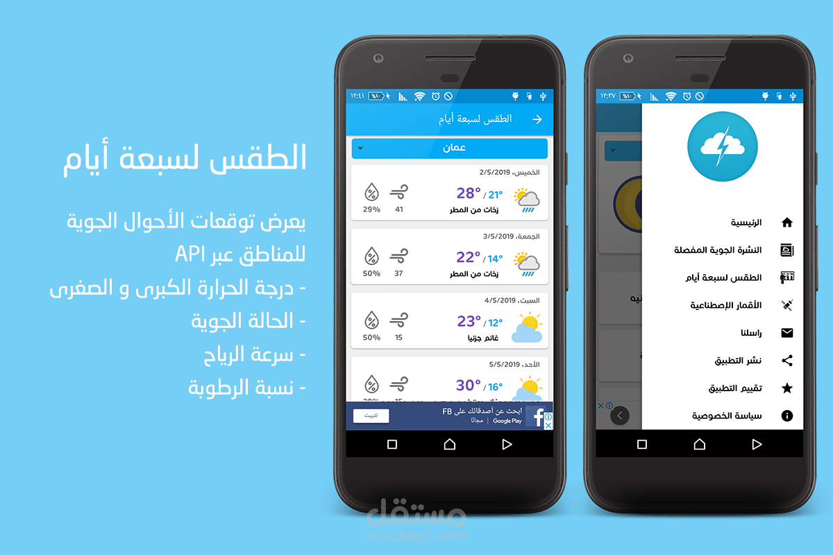 تحديث بيانات الطقس تلقائياً عبر API | دعم 48 حالة جوية مختلفة | مدن متعددة | تغيير ايقونة الطقس حسب الوقت | قسم الأخبار | شريط الخبر العاجل | إدراج محتوى الأخبار عبر لوحة التحكم Firebase | معرض صور غير محدود لكل خبر | أداة تغيير حجم الخط | توقعات الطقس لسبعة أيام | خرائط الطقس المباشرة (رادار الأمطار و خريطة الغيوم)