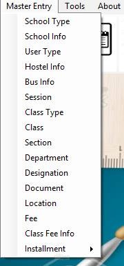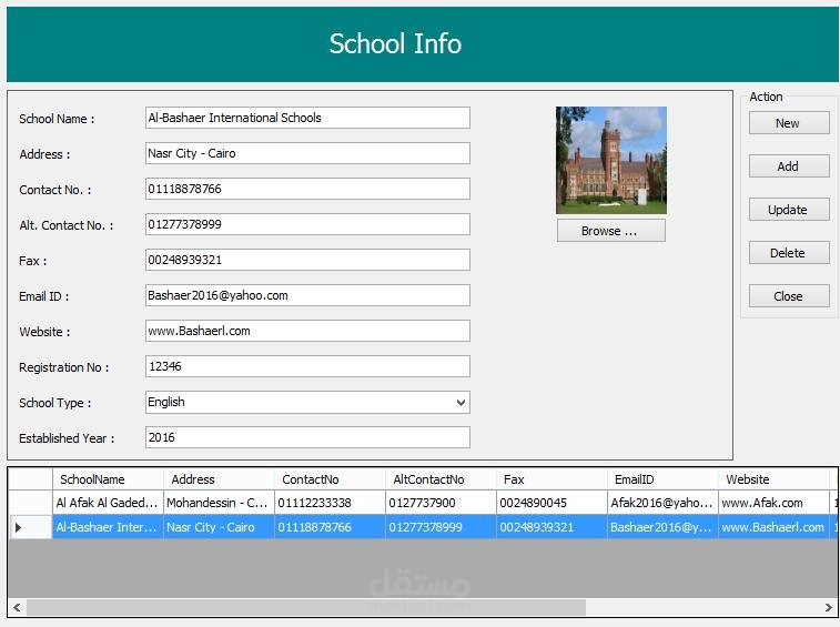 من خلالها يمكن التعرف على معلومات عامه للمدرسة مثل إسم المدرسة - عنوانها - طريقة التواصل سواء بالفاكس او الموبايل أو الويب سايت مع ذكر نوع المدرسة وسنة الإنشاء بالإضافة إلى إرفاق صورة للمدرسة، كل ذلك من خلال الحذف والتعديل والإضافة.