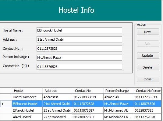 ويتم من خلالها التعامل مع بيانات الهوتيل -سكن الطلبة- سواء الإسم والعنوان وإسم المسئول وطريقة التواصل بالحذف والتعديل والإضافة.
