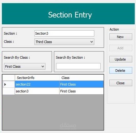 ويتم من خلالها تحديد الأقسام أو الشعب الخاصة بالطلبة عن طريق الحذف والتعديل والإضافة بالإضافة إلى البحث بإسم القسم أو إسم الفصل أو كليهما معا