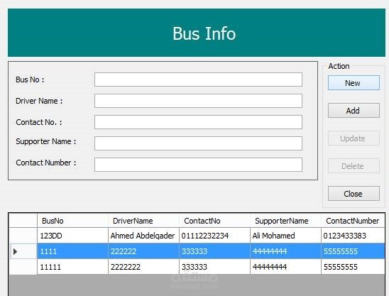 يتم من خلالها إضافة أو حذف أو تعديل المعلومات الخاصة بباصات المدرسة .. عن طريق تسجيل رقم الباص - إسم السائق - رقم المحمول الخاص بالسائق - إسم مسئول الباص - رقم المحمول الخاص بمسئول الباص