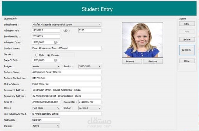 تعتبر من أهم الواجهات في البرنامج المسئولة عن تسجيل الطالب سواء الإسم، إسم المدرسة، رقم التسجيل، والنوع، تاريخ الميلاد، إسم الأب، موبايل الأب، إسم الأم،إسم المدرسة السابقة إن وجد ، والعنوان الرئيسي، وعنوان أخر، والتواصل سواء بالموبايل أو البريد الإلكتروني وإسم الفصل، مع إمكانية إضافة صورة للطالب.
