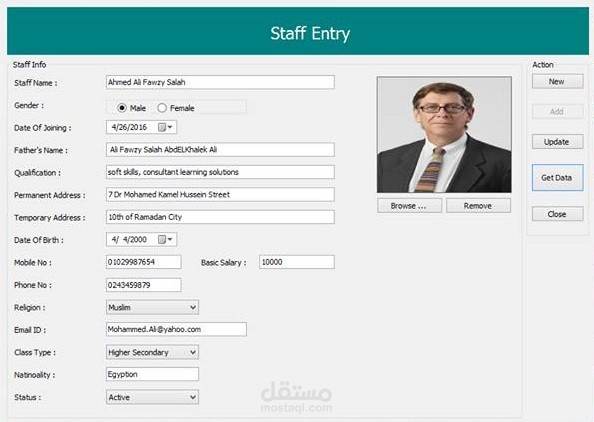 تعتبر من أهم الواجهات في البرنامج المسئولة عن تسجيل الأستاذ سواء الإسم، إسم المدرسة، رقم التسجيل، والنوع، تاريخ الميلاد، المؤهلات، ، والعنوان الرئيسي، وعنوان أخر، والتواصل سواء بالموبايل أو البريد الإلكتروني وإسم الفصل، مع إمكانية إضافة صورة الاستاذ
