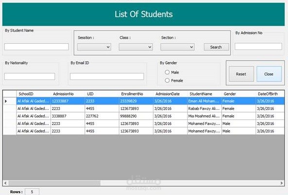 وهي المسئولة عن عرض جميع المعلومات الخاصة بالطلبة مع إمكانية البحث سواء بالإسم ، النوع ، الجنسيه، إسم الفصل، البريد الإلكتروني