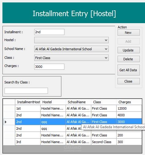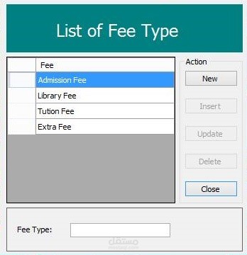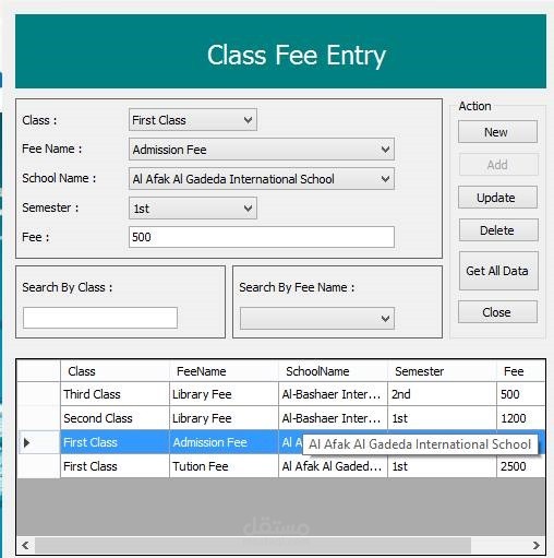 ويتم من خلالها تحديد مصاريف الفصل خلال ترم واحد مع تحديد نوع المصاريف مثل مصاريف المكتبة ومصاريف الدخول ومصاريف المحاضرات بالطبع مع إمكانية الحذف والإضافة والتعديل والبحث سواء عن طريق إسم الفصل أو نوع المصاريف أو كليهما معا