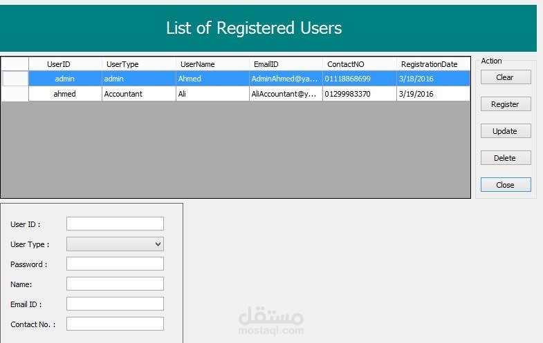 وهي المسئولة عن إدخال مستخدم جديد، عن طريق إدخال الإسم، إسم المستخدم، كلمة المرور، والإيميل والموبيل مع تسجيل تاريخ إنشاء المستخدم على قاعدة البيانات ويمكننا حذف مستخدم موجود أو التعديل عليه، مع عدم إمكانيه حذف المستخدم لنفسه لوجوده داخل البرنامج بالفعل.