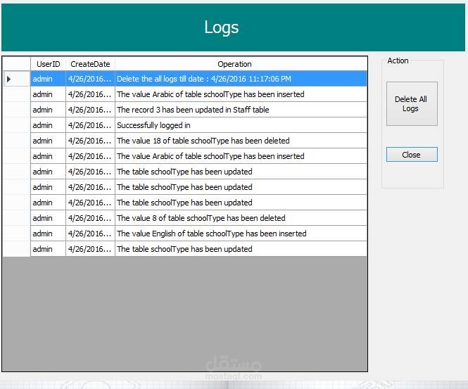 يتم من خلالها تسجيل كل الإجراءات على قاعدة البيانات سواء إضافة بيان جديد أو تعديل بيان حالي أو حذف بيان موجود، مع تحديد المستخدم الذي قام بهذا الإجراء وتاريخ التنفيذ.
