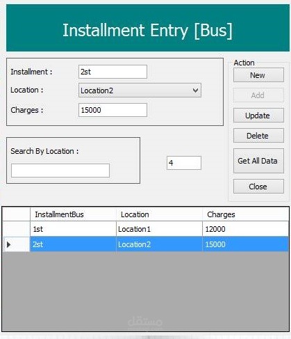 ويتم من خلالها تحديد الأقساط الواجب دفعها الخاصة بباصات الشركة مع تحديد قيمة كل قسط، ويمكننا التعديل أو الحذف أو إدخال قسط جديد، مع إمكانية البحث بإسم الموقع.