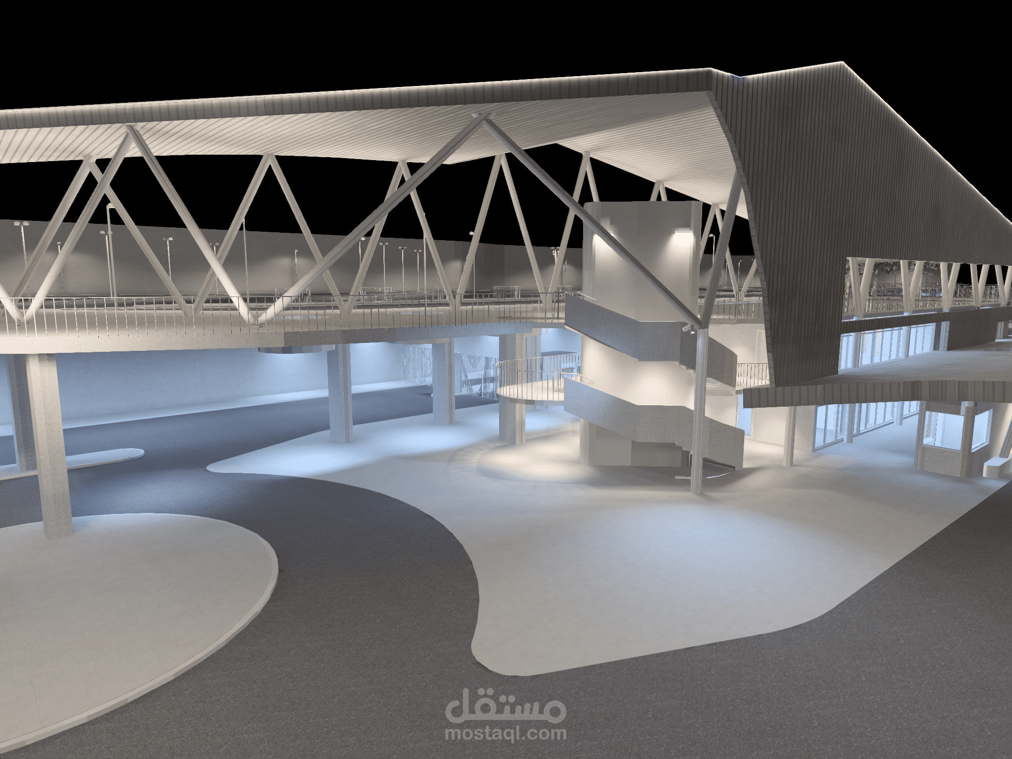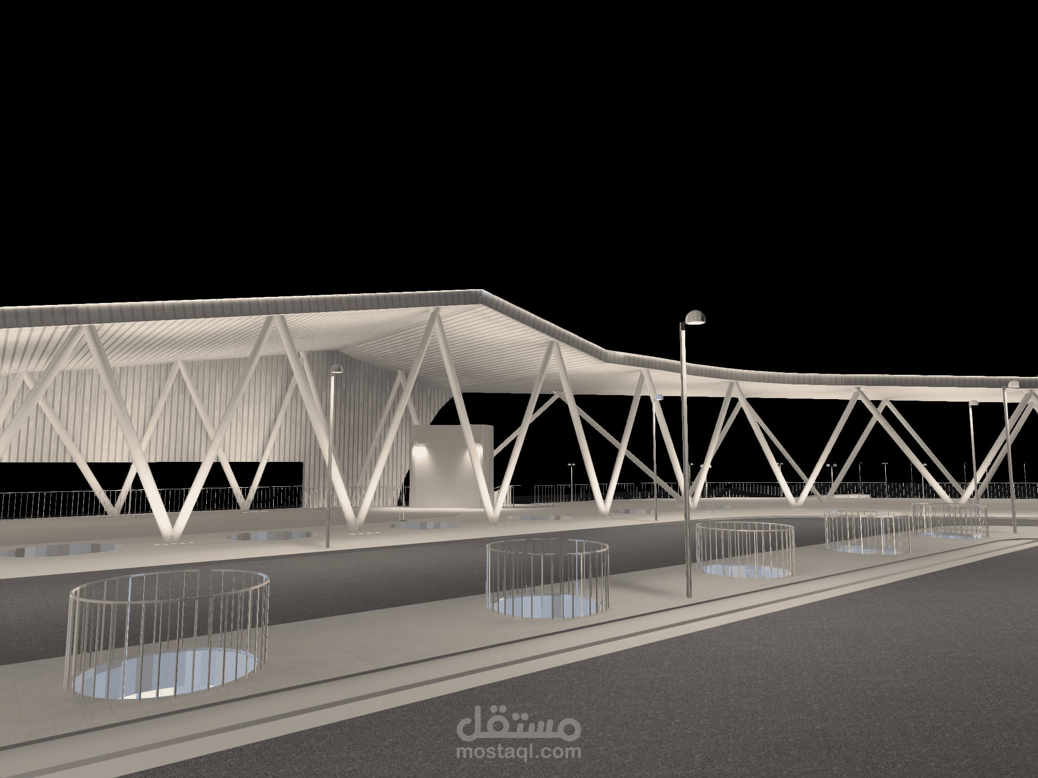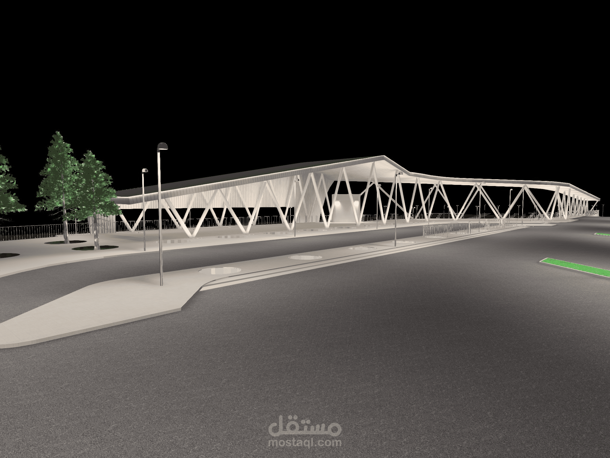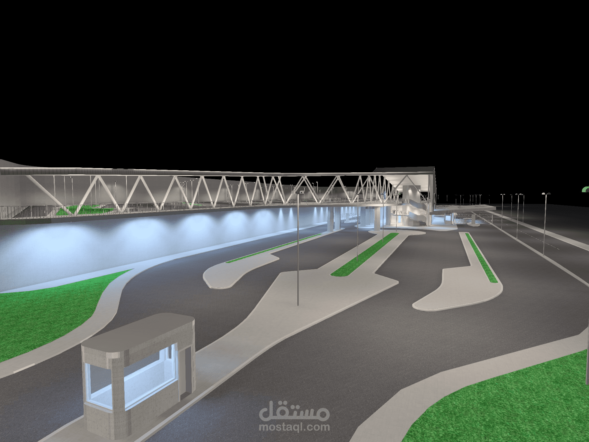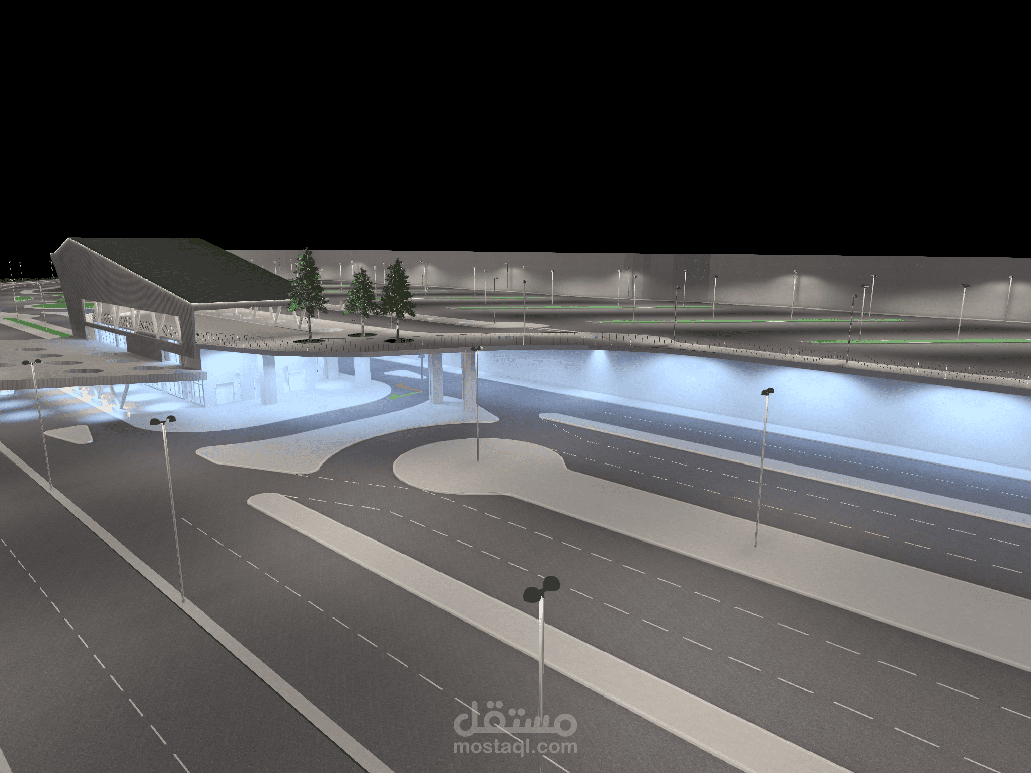 يُظهر هذا العمل تصميم إضاءة متكامل لمحطة متعددة الوظائف تشمل مبنى رئيسيًا حديثًا، جسرًا علويًا للمشاة، ومواقف سيارات موزعة على عدة مستويات.