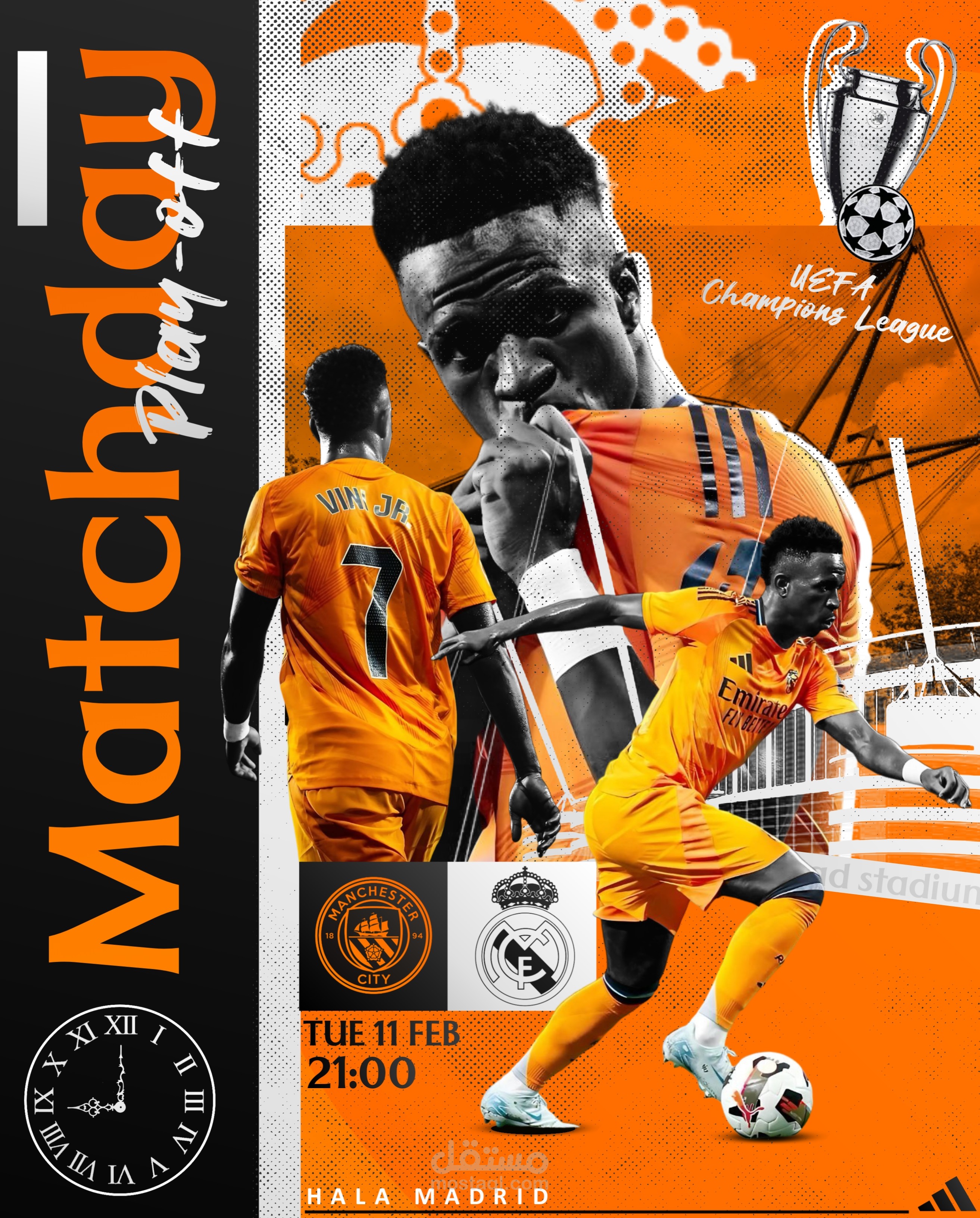 • تصميم جرافيكي احترافي يُبرز أجواء مباراة في دوري أبطال أوروبا بين ريال مدريد ومانشستر سيتي. استخدمت في التصميم عناصر بصرية مميزة مثل دمج الصور بطريقة ديناميكية، ولوحة ألوان بالأسود والبرتقالي لخلق طابع حماسي، مع توظيف خطوط وأيقونات تتناسب مع هوية البطولة. تم التركيز على اللاعب فينيسيوس جونيور كنقطة محورية لإبراز البعد العاطفي والحماسي للمباراة.