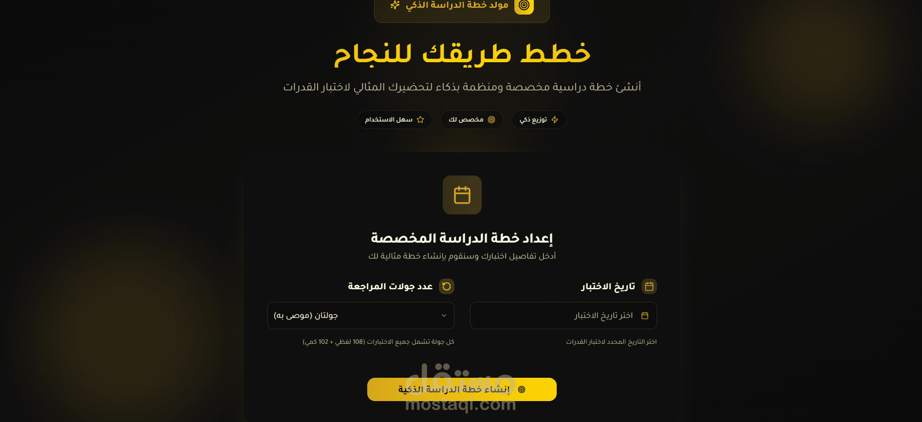 - **مولد خطط دراسية ذكية:** ينشئ جداول مخصصة بناءً على تاريخ الاختبار