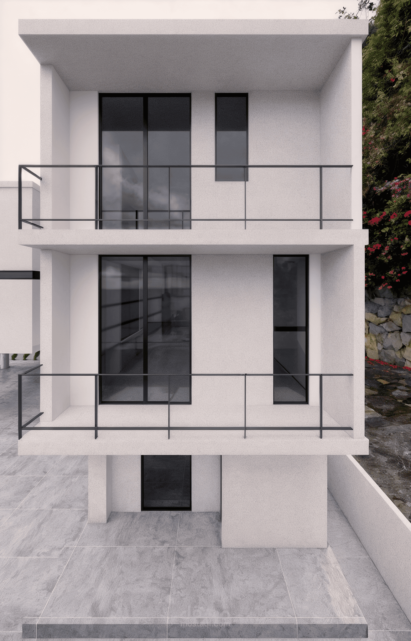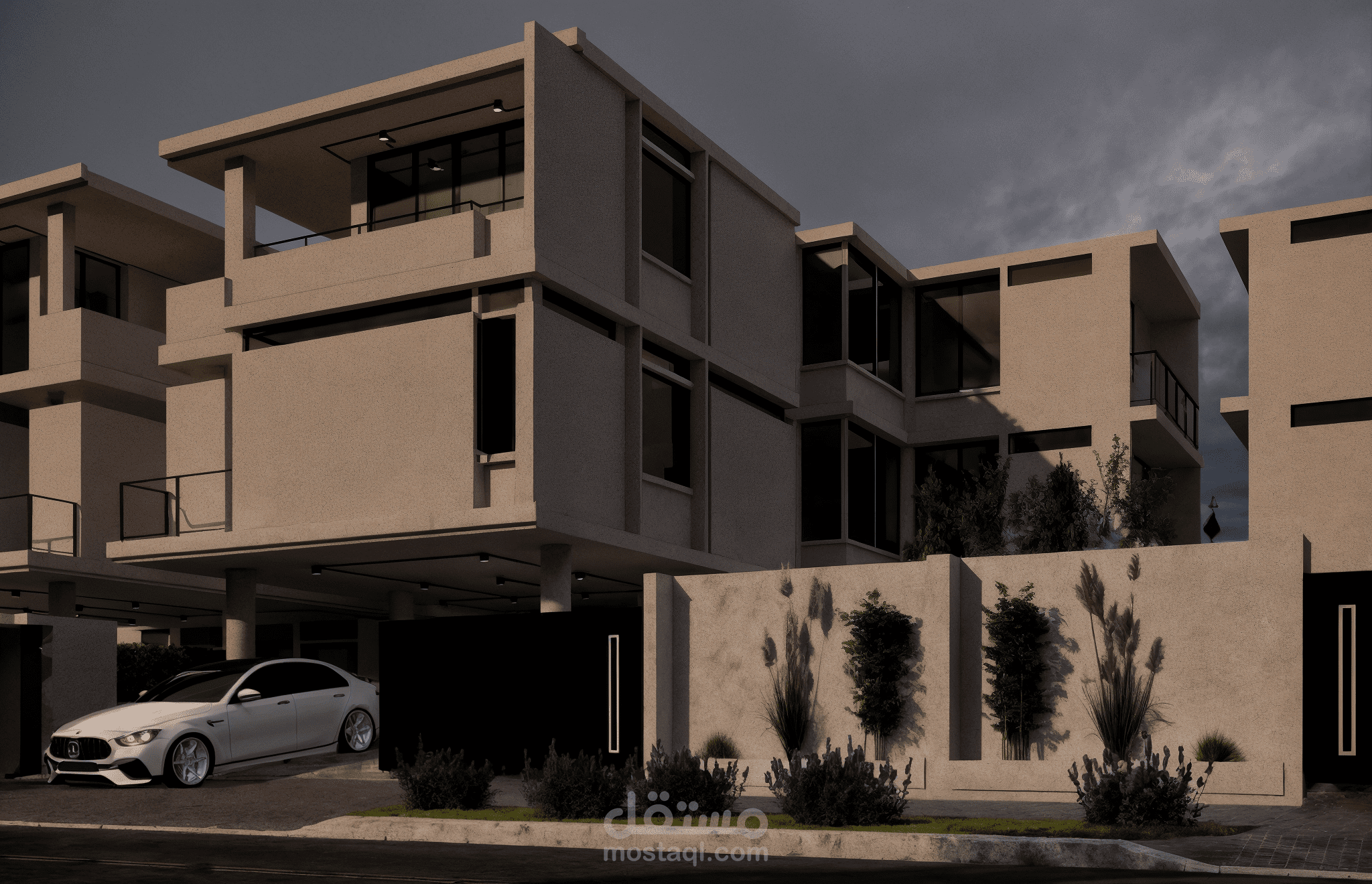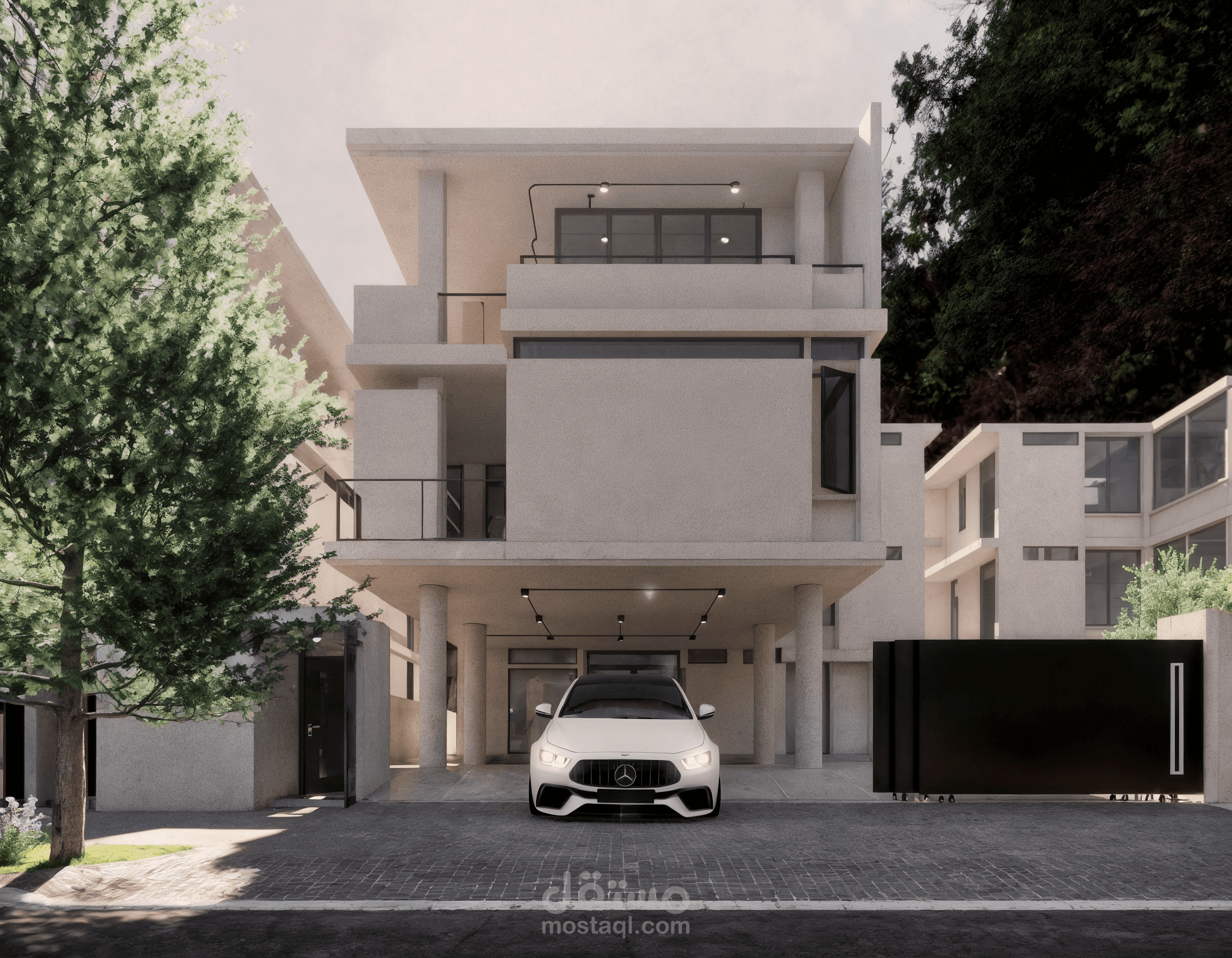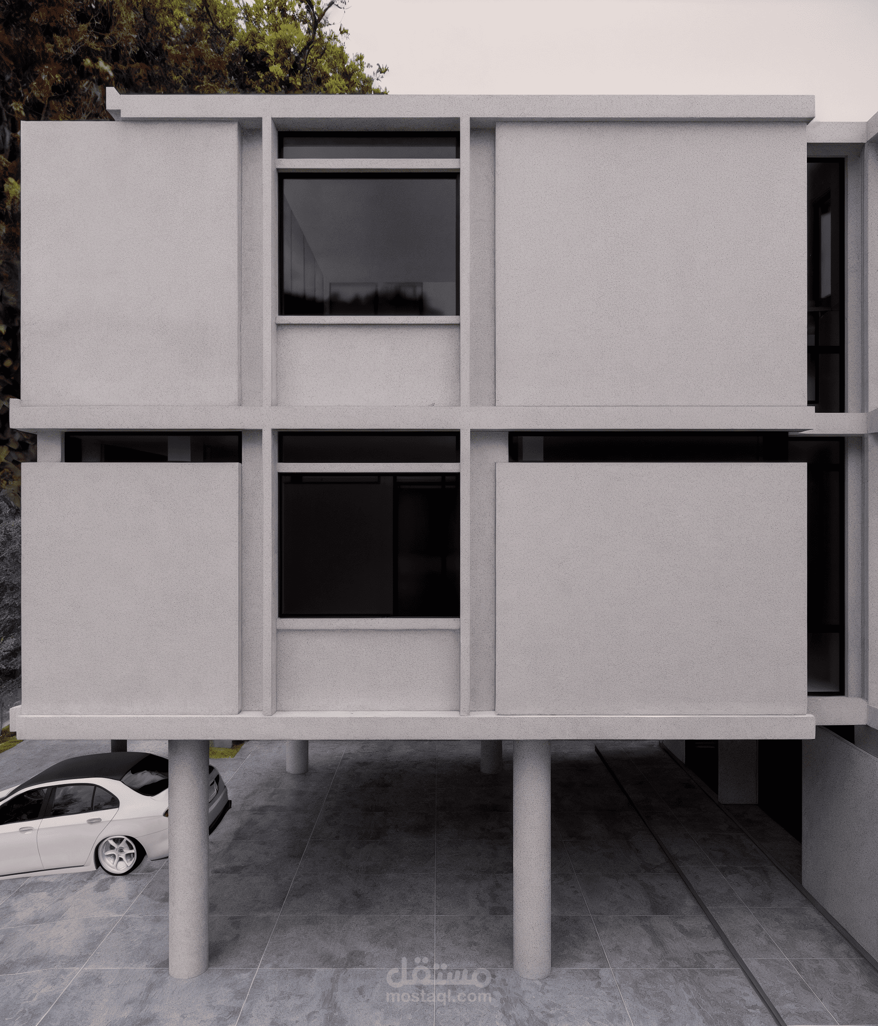 تصميم لفيلا سكنية بطابع مودرن واضح وبسيط. ركزت على الخطوط النظيفة والأحجام الهندسية الواضحة لخلق مظهر جريء ومعاصر. استخدمت الأبيض كلون رئيسي مع لمسات من الأسود في النوافذ والبوابة لتباين أنيق. تصميم الواجهة بيعتمد على تكوينات كتلية متداخلة، مع بروزات وشرفات تعطي عمق وحيوية للمبنى. المدخل مفتوح على كراج مغطى وأعمدة رشيقة بتدعم السقف، وتجعل الفراغ العام أكثر تهوية وانفتاح. السيارة في المقدمة تعطي إحساس بالواقعية للمشهد وتعزز من تصور الاستخدام العملي للتصميم. الاهتمام بالإضاءة الطبيعية كان جزء مهم من الفكرة، وحرصت على استخدام واجهات زجاجية كبيرة لهذا الغرض. التصميم بيعبر عن أسلوبي في المزج بين العملية والبساطة الجمالية بأسلوب عصري وواضح.