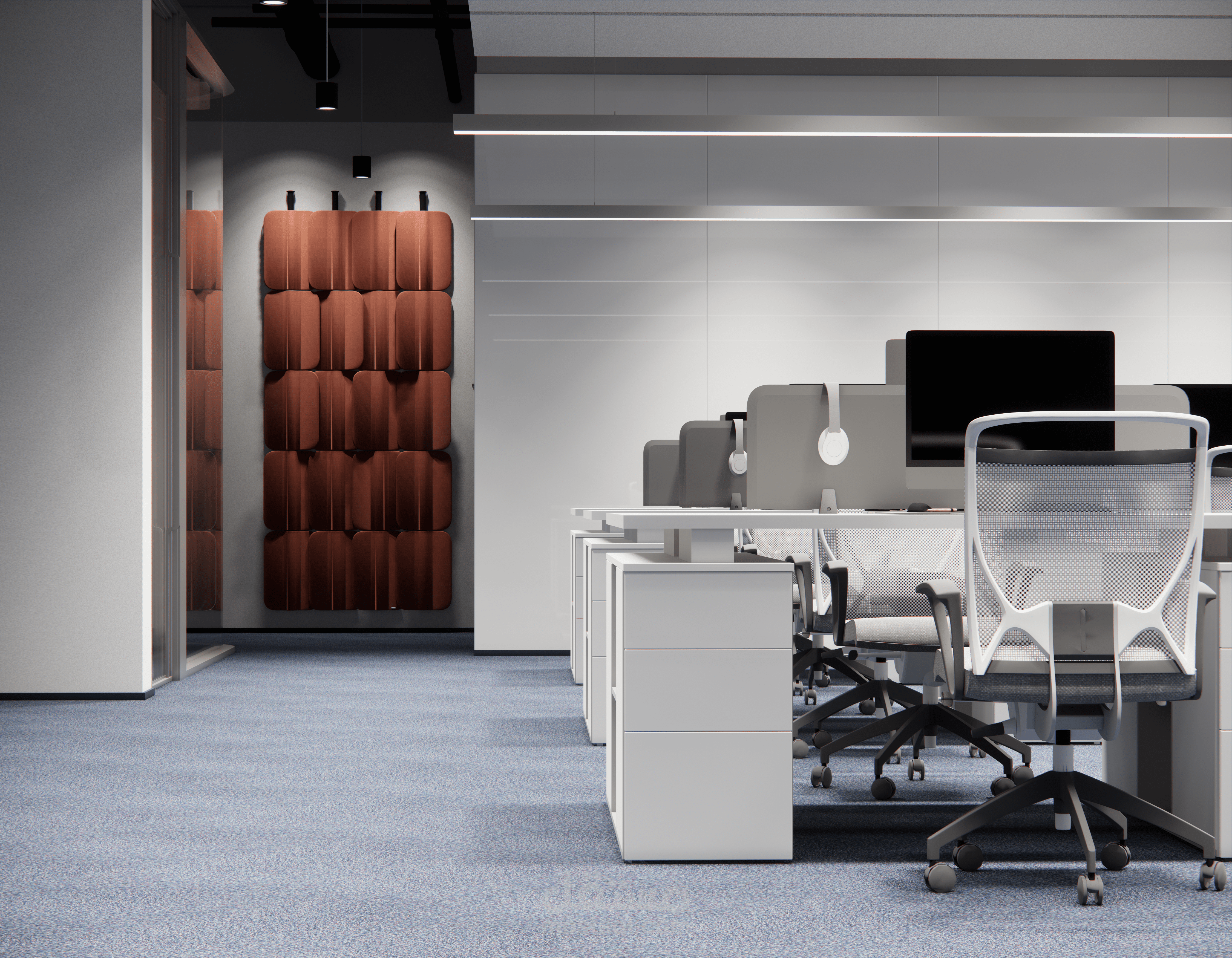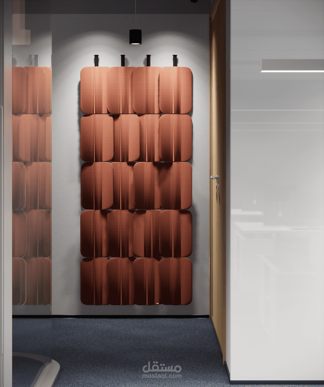 تصميم مساحة مكتبية عصرية، تدمج بين النقاء البصري والوظيفة العملية، ضمن بيئة عمل مفتوحة ومريحة. ركزت على ستايل مينيمالي حديث، بألوان حيادية هادئة زي الأبيض والرمادي، مع لمسات دافئة من البني في تفاصيل الجدار الخلفي المعالج بقطع ديكور ناعمة تعطي طابعًا فنيًا وصوتيًا بنفس الوقت.