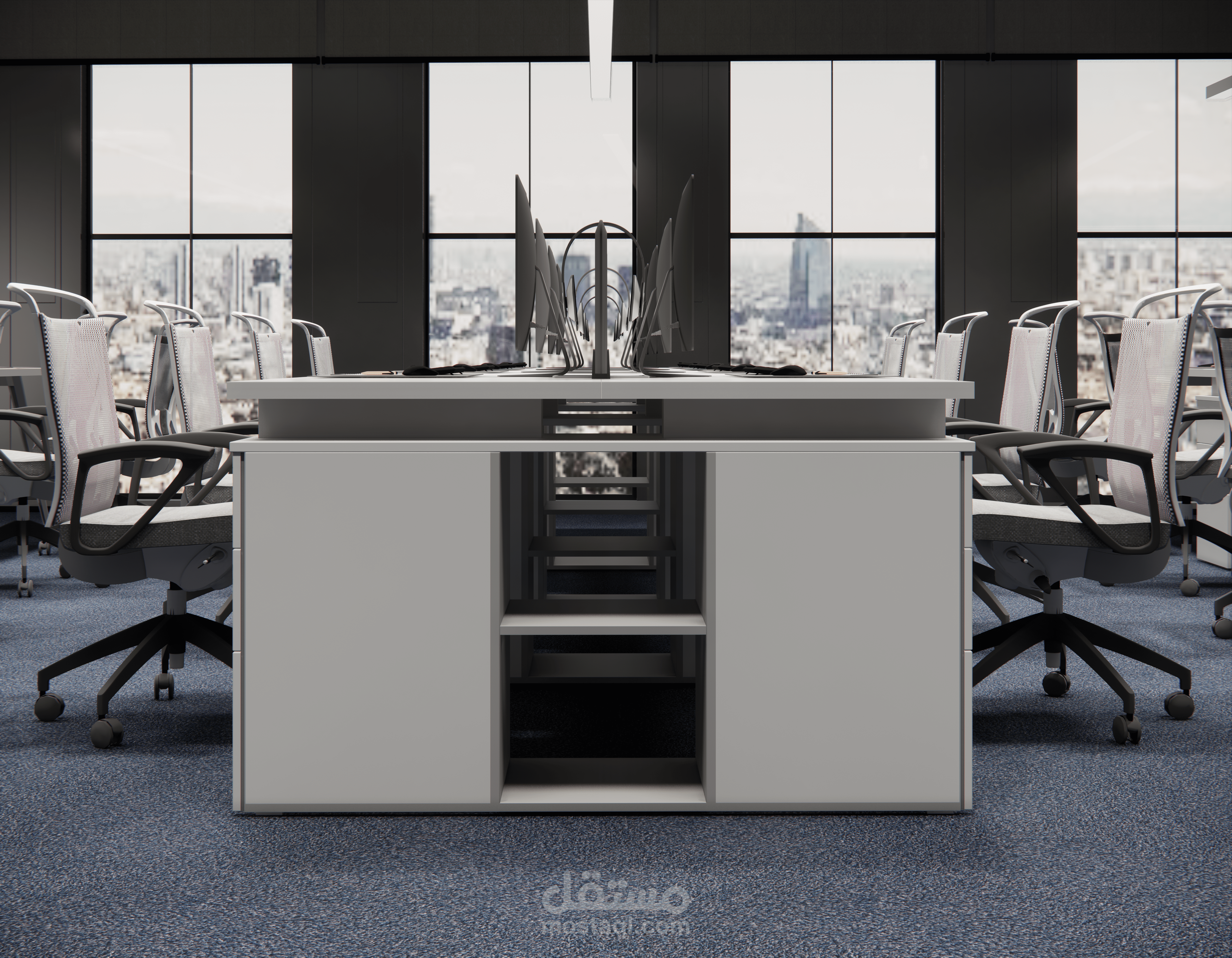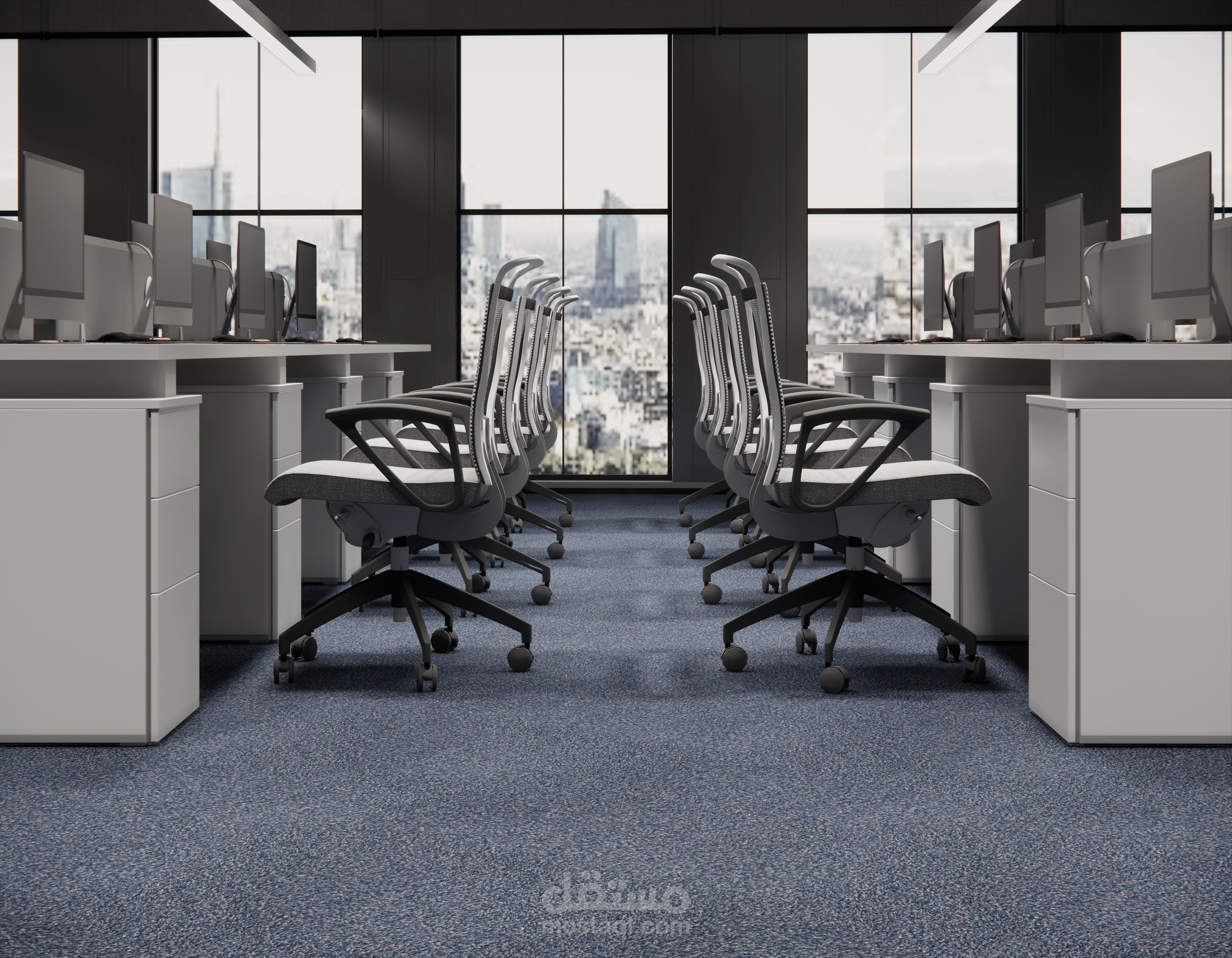 وزعت المكاتب بشكل منتظم يسمح بحرية الحركة وتواصل بصري واضح بين الأفراد، مع استخدام أثاث عملي ومريح، مثل الكراسي الشبكية ذات التصميم الديناميكي. الإضاءة كانت عنصر أساسي، فاعتمدت على خطوط إضاءة ناعمة مدمجة بالسقف لتعزيز الإحساس بالهدوء والانضباط، دون إزعاج بصري.