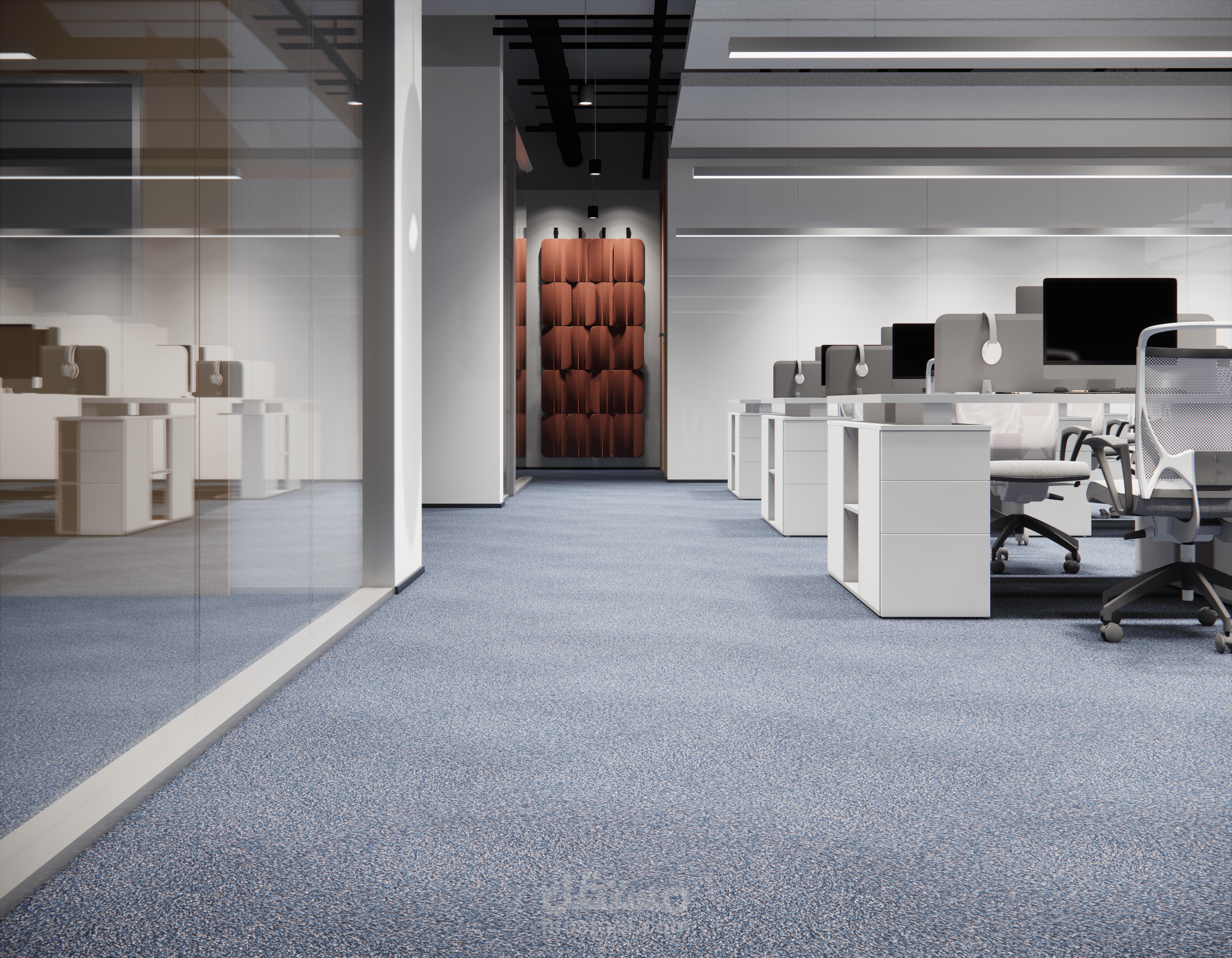 أما الأرضية، فتم اختيارها بسجاد بدرجة زرقاء باهتة تضيف لمسة من الاسترخاء وتعزز عزل الصوت، خصوصًا في بيئة عمل مفتوحة. المشهد العام يعطي انطباع بالاحترافية والرقي، مع الحفاظ على أجواء مريحة تساعد على التركيز والإبداع.