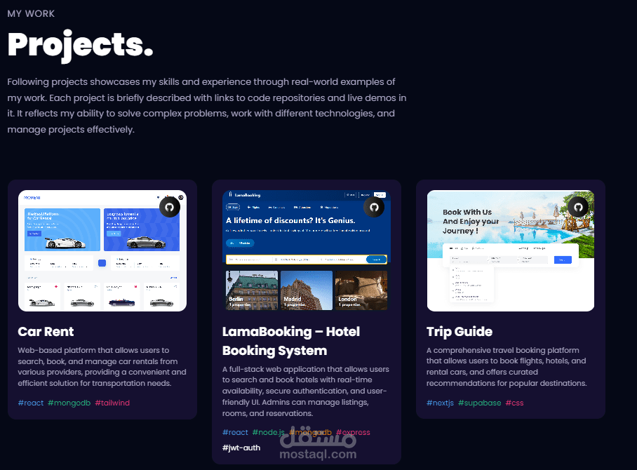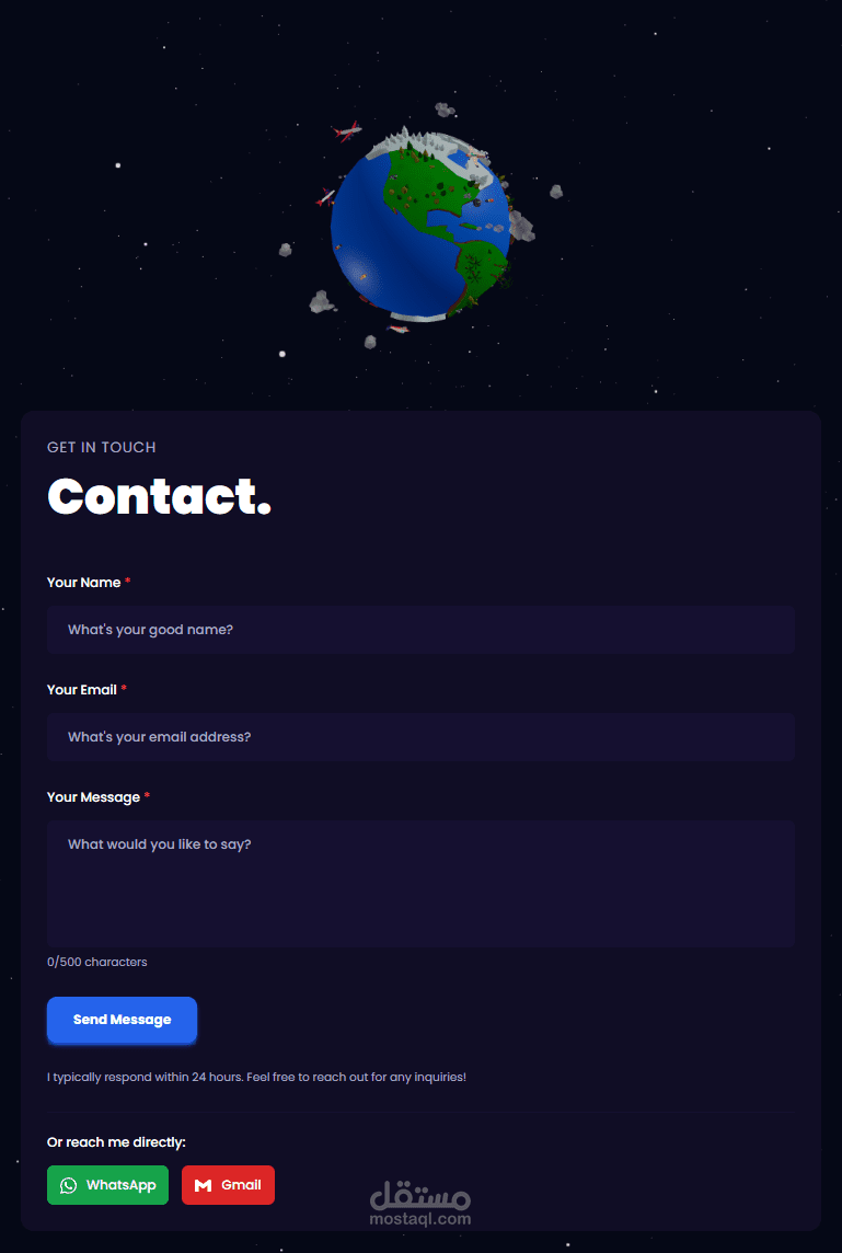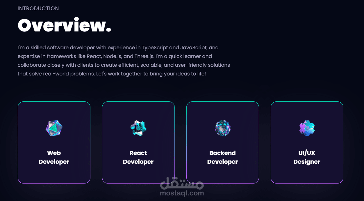 مشروع 3D Portfolio هو منصة ويب تفاعلية تعرض أعمالك أو منتجاتك بشكل ثلاثي الأبعاد مميز يجذب الانتباه. تم تصميمه باستخدام تقنيات حديثة مثل Three.js أو WebGL ليضيف لمسة جمالية مذهلة ويمنح الزائر تجربة فريدة.