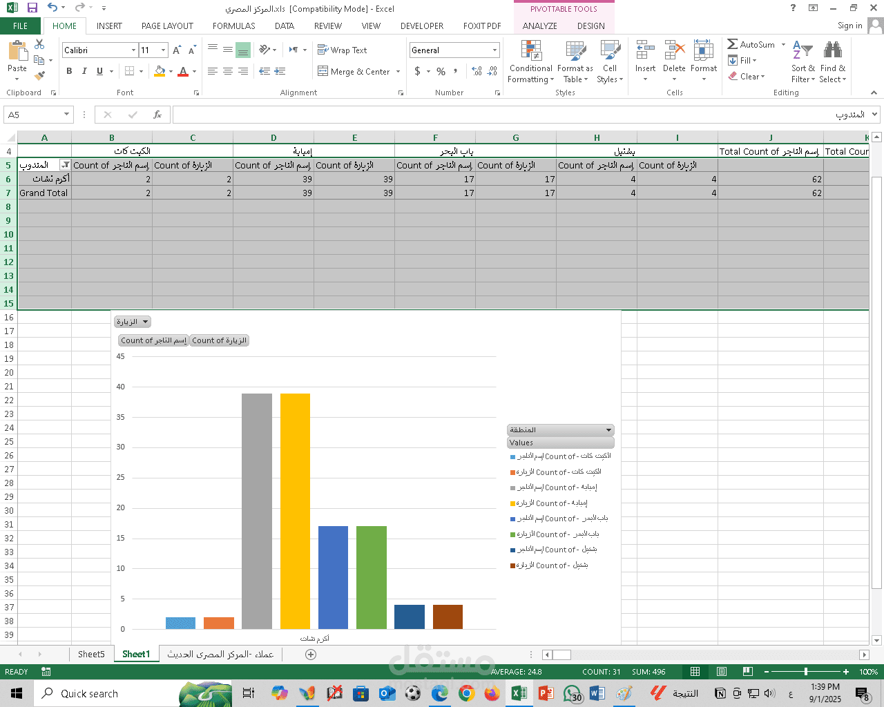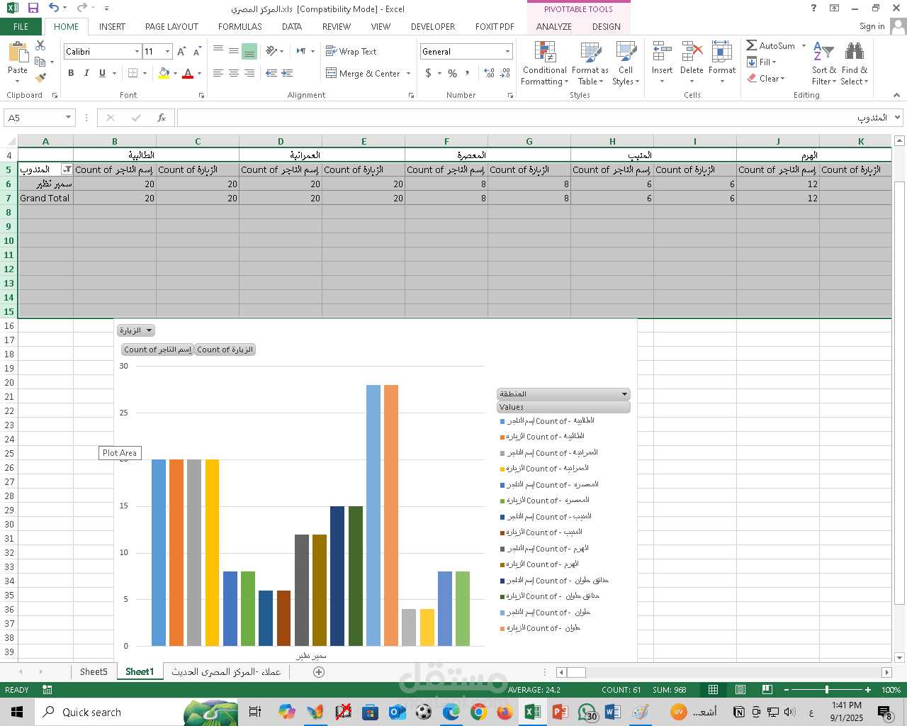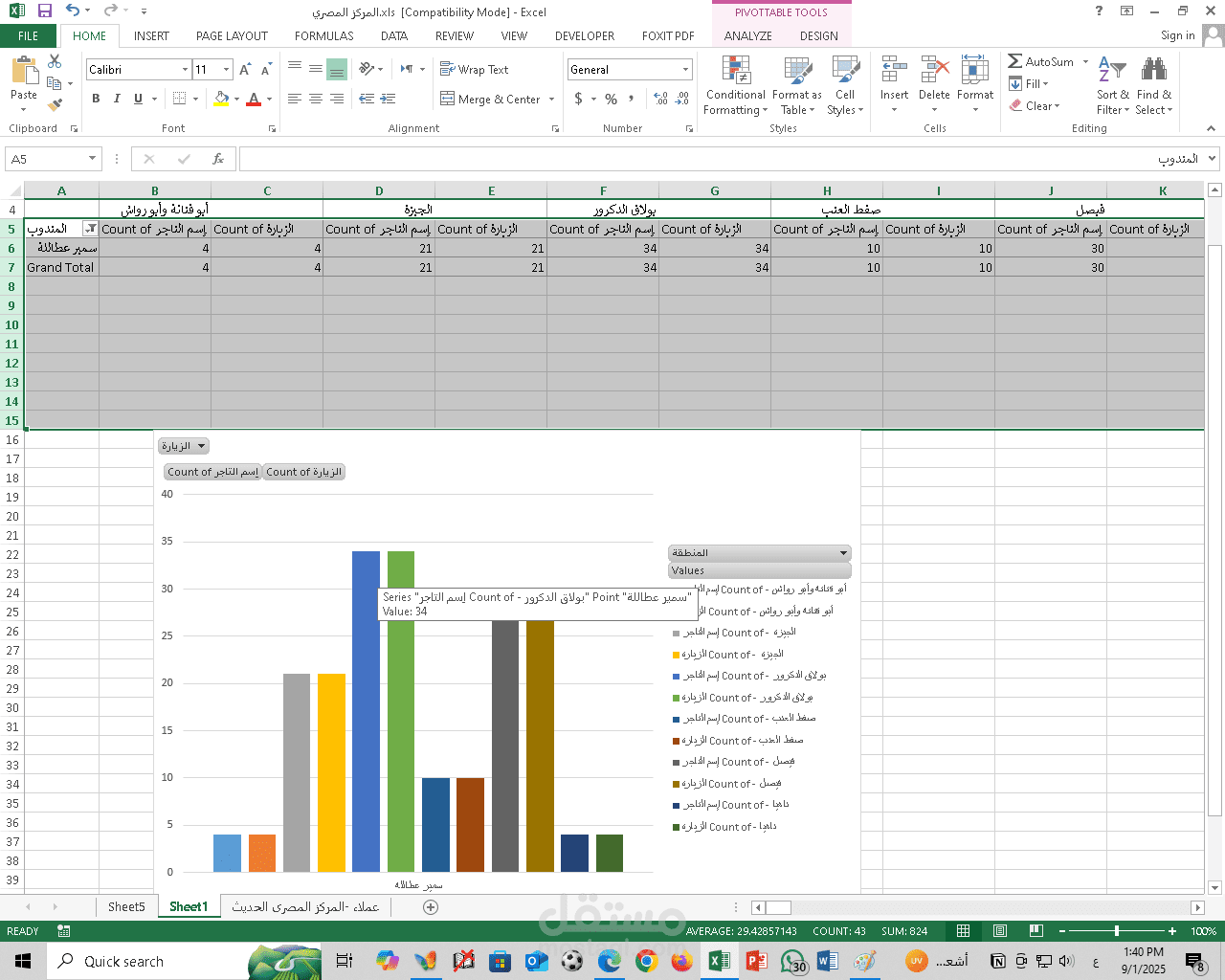 أنشأت PivotTables لعمل ملخصات حسب المندوب وحسب المنطقة.