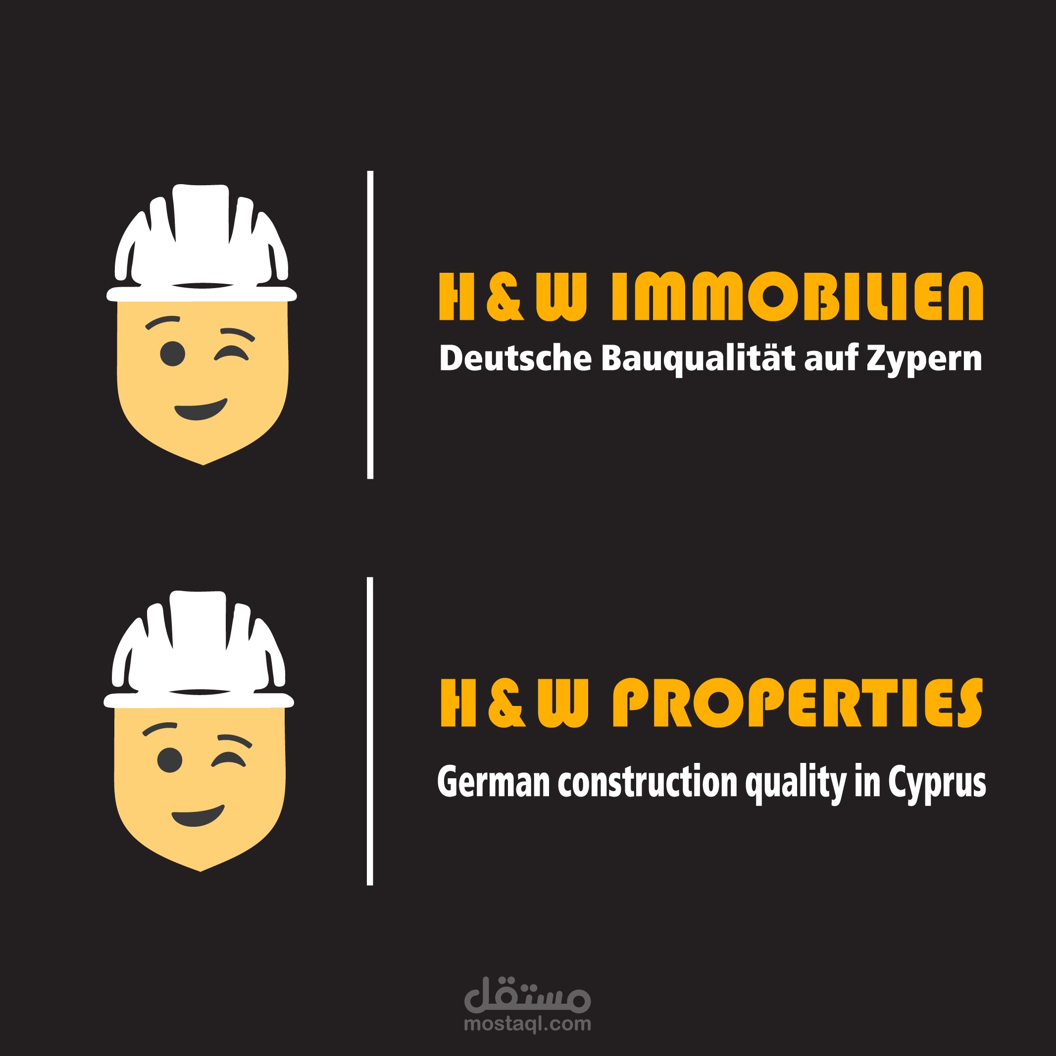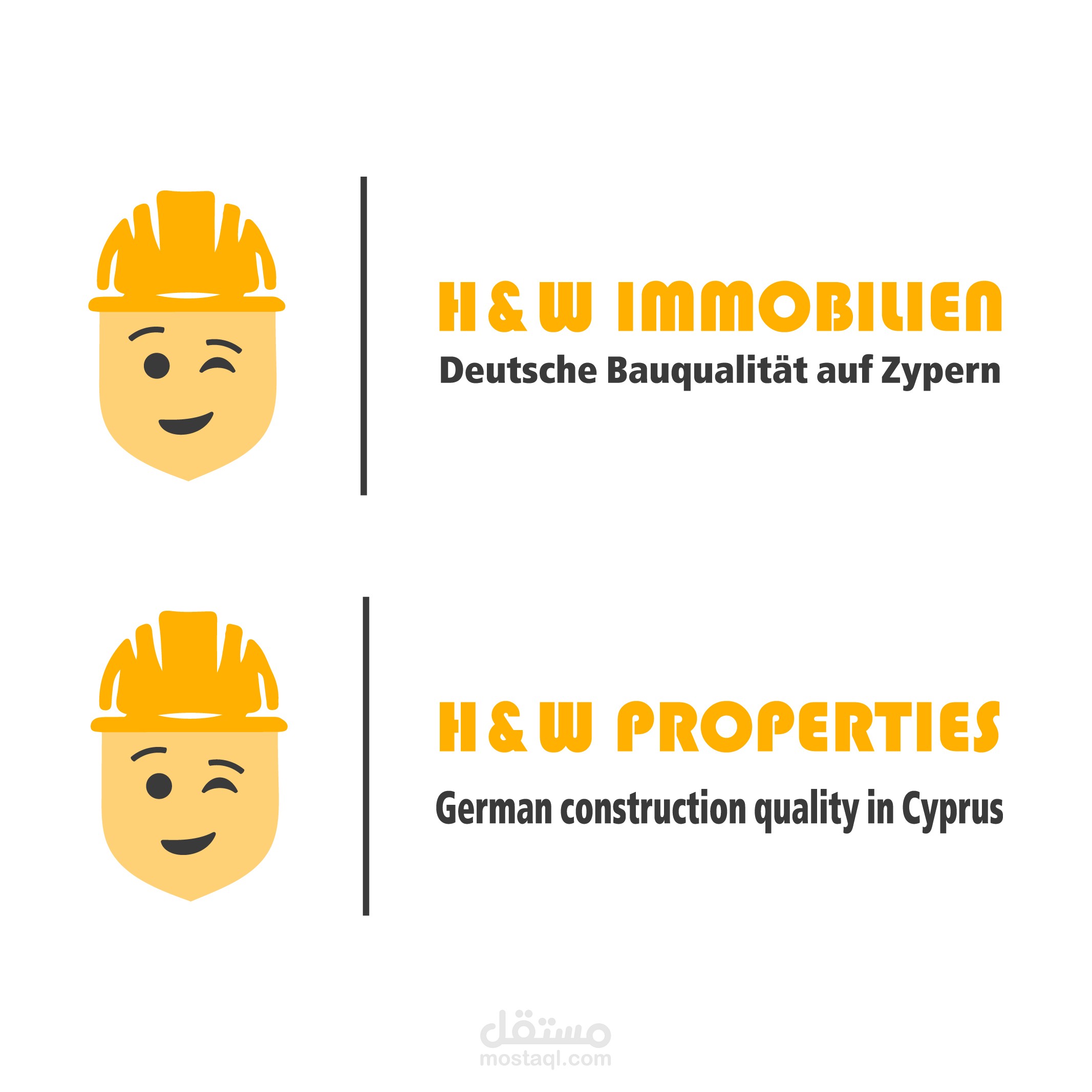 يجسد شعارH&W Properties القيم الأساسية للعلامة التجارية: التميز الهندسي الألماني، والموثوقية، وجودة البناء العالية في قبرص. يرمز رمز عامل البناء المبتسم إلى الخبرة والدقة وسهولة التواصل، بينما ترمز الغمزة إلى الثقة، مما يعزز التزام الشركة بالمعايير العالية.