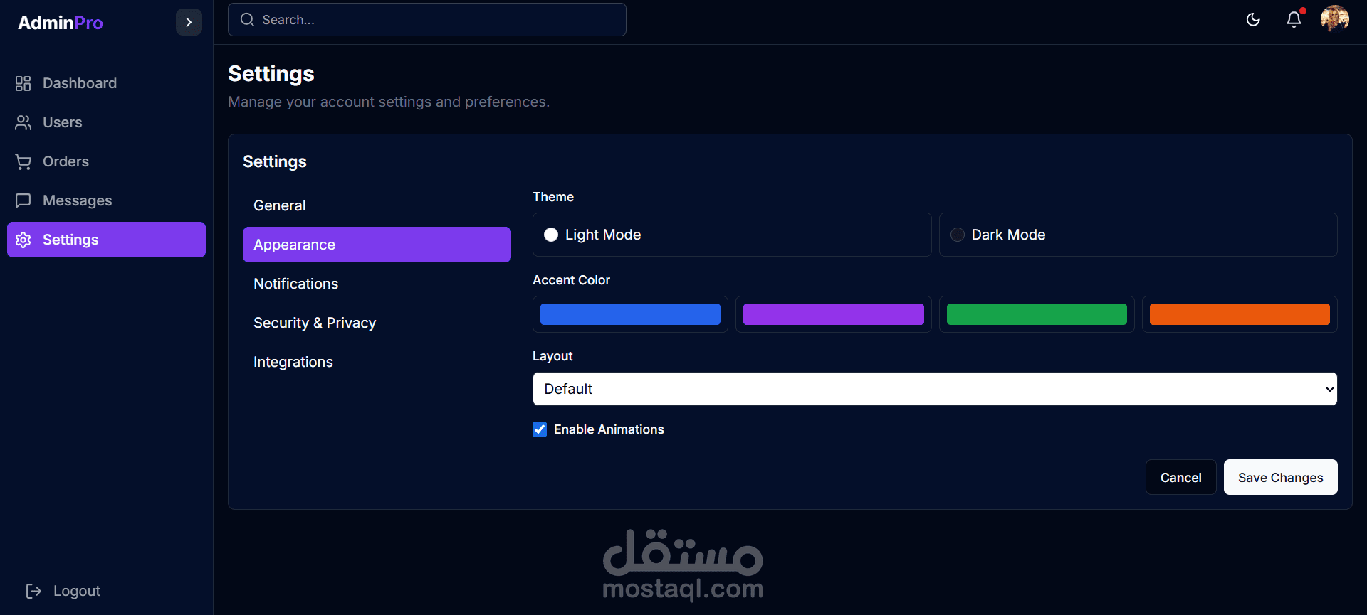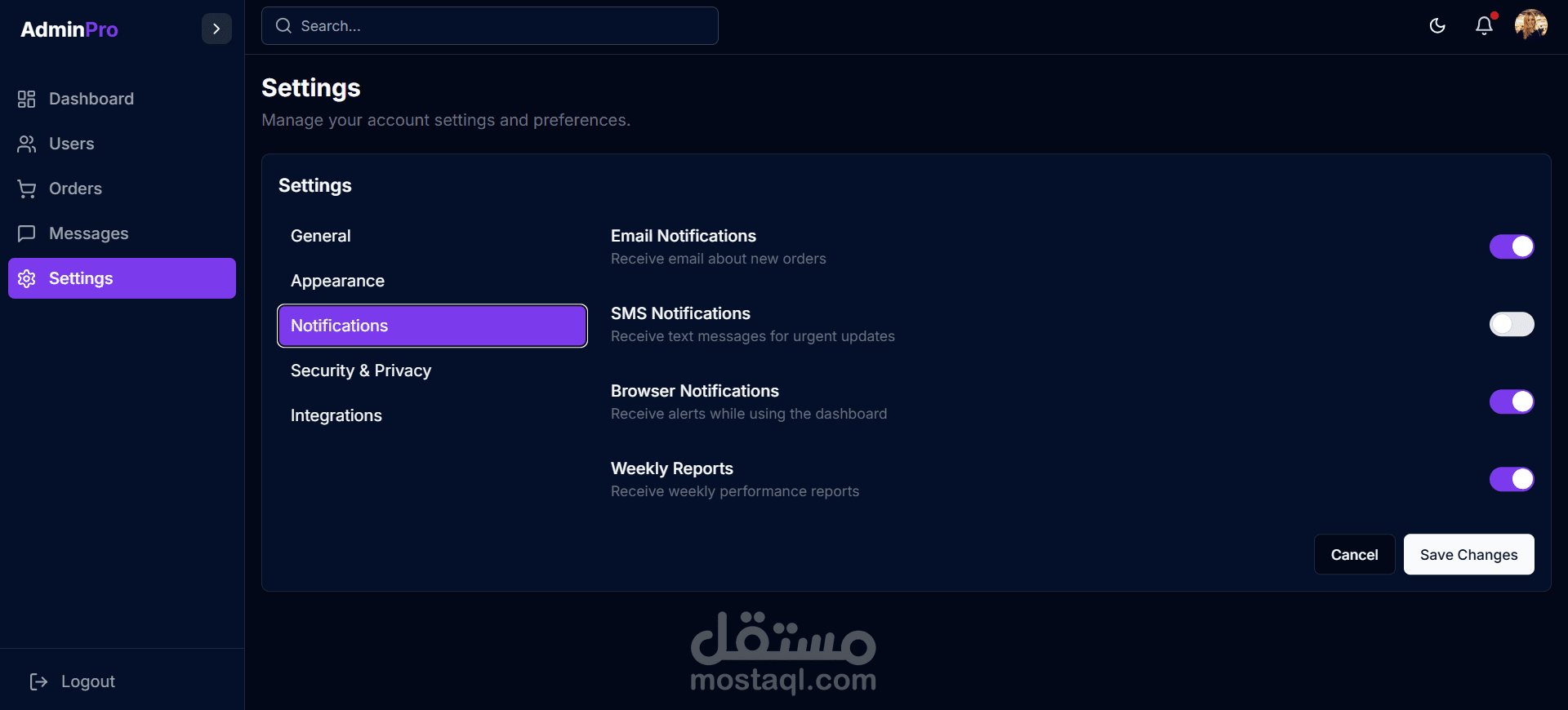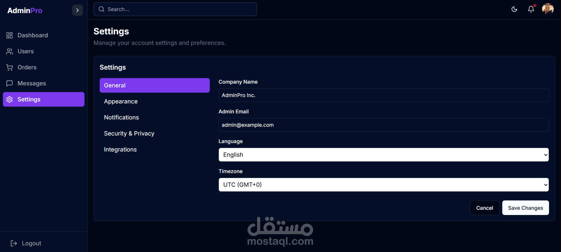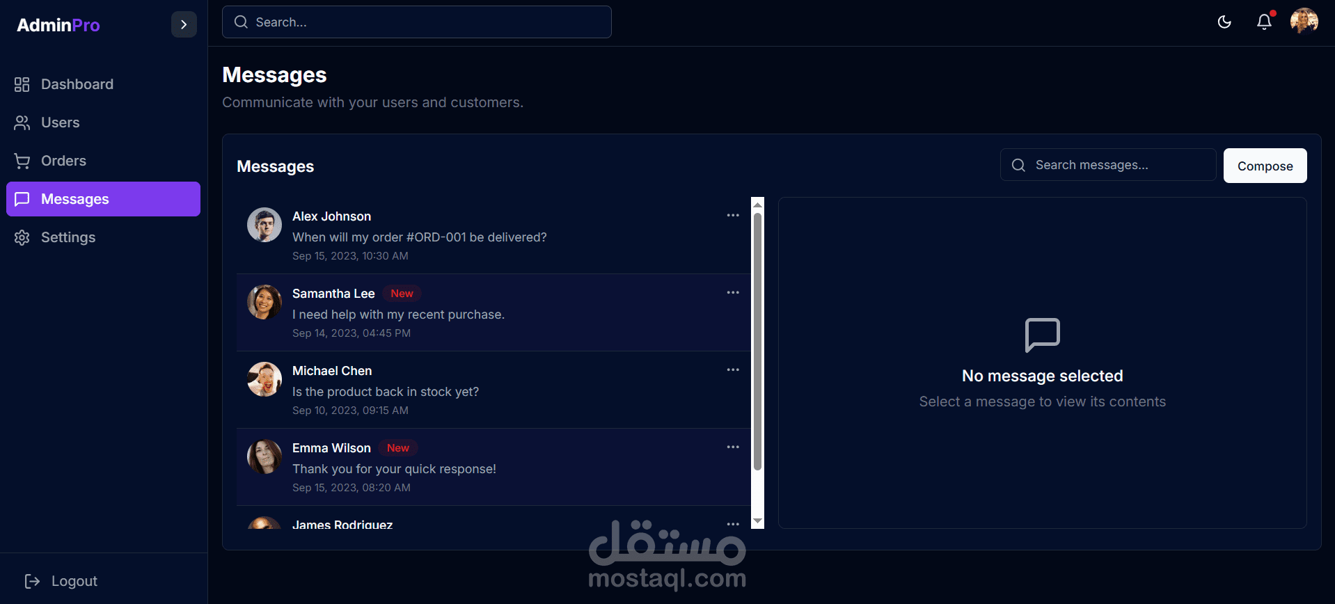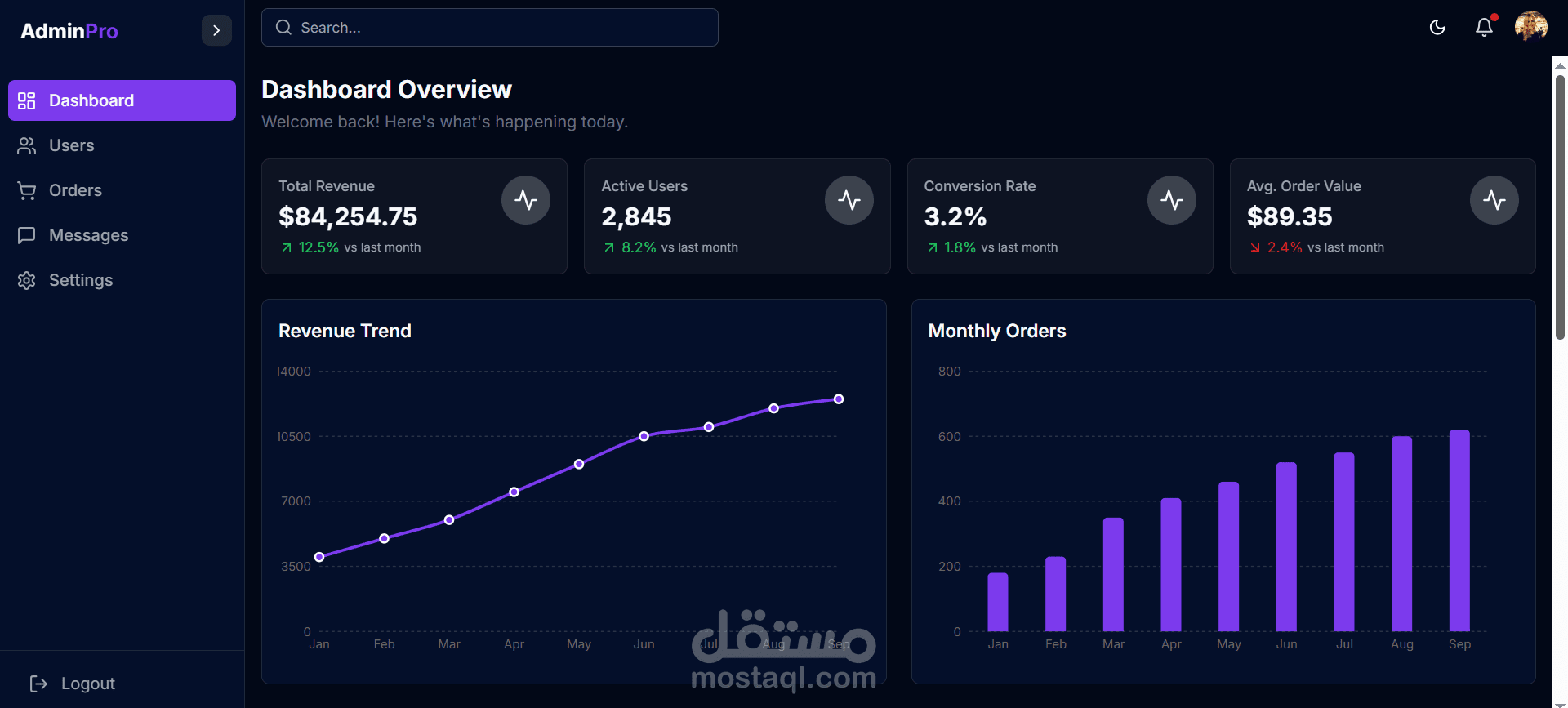 تطبيق ويب متكامل تم تطويره باستخدام React, TypeScript, وVite، يهدف إلى توفير واجهة إدارية حديثة، منظمة، وسريعة الاستجابة لإدارة المستخدمين، الطلبات، الرسائل، والإعدادات. يعتمد المشروع على تصميم نظيف باستخدام Tailwind CSS، ورسوم متحركة سلسة بفضل Framer Motion.