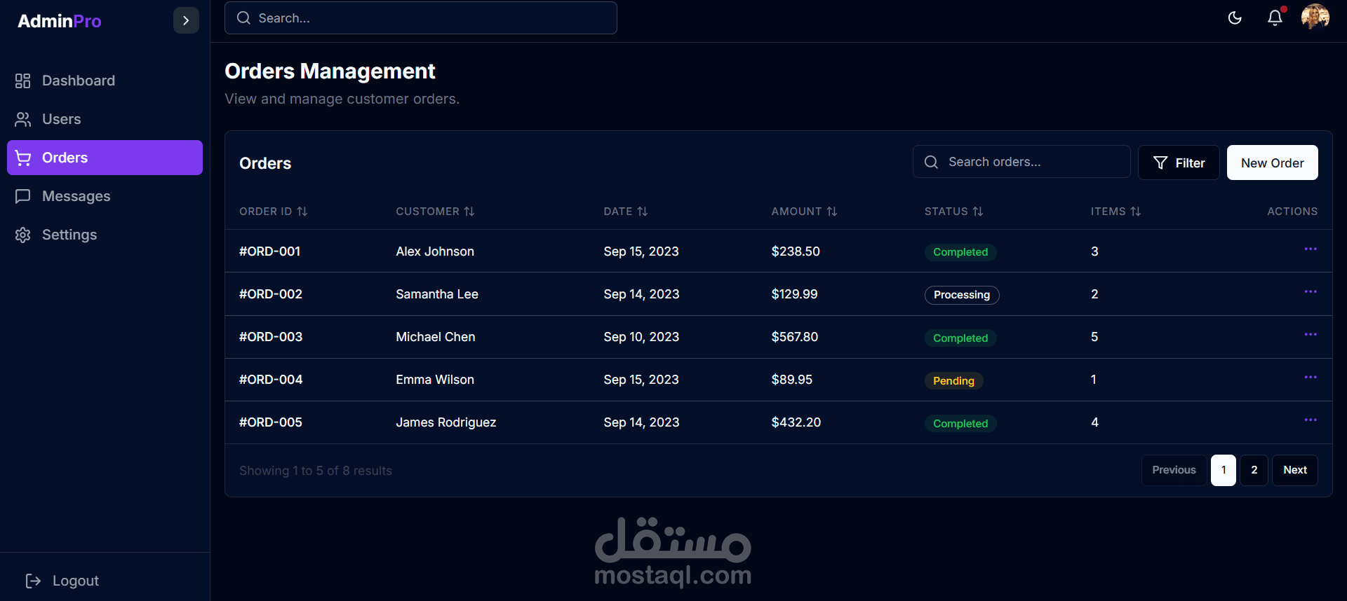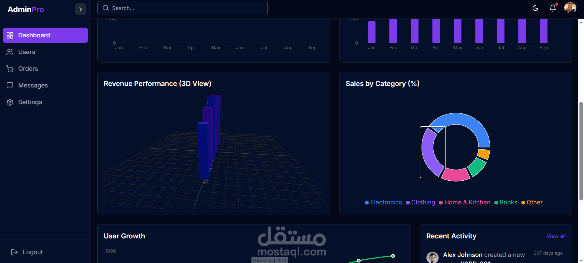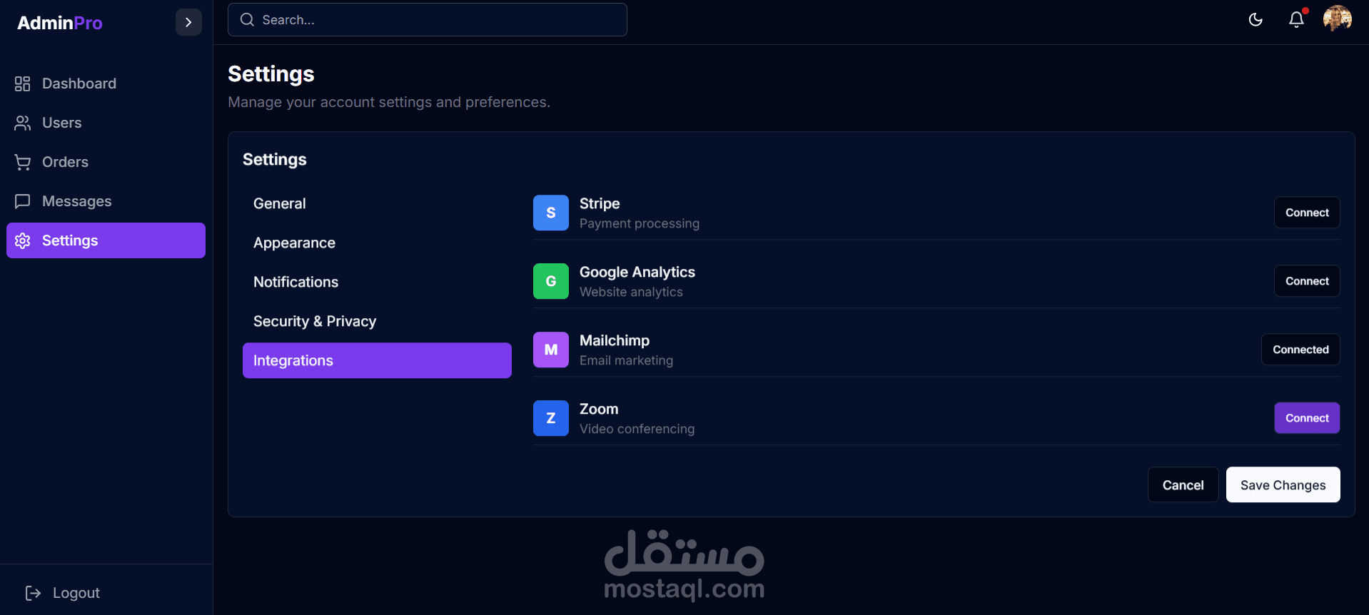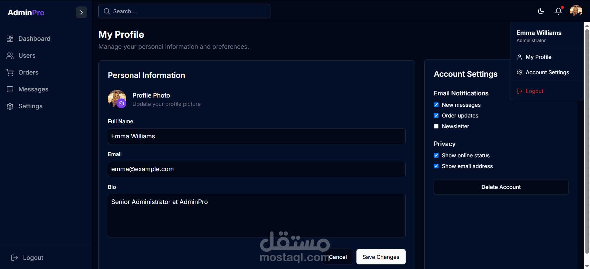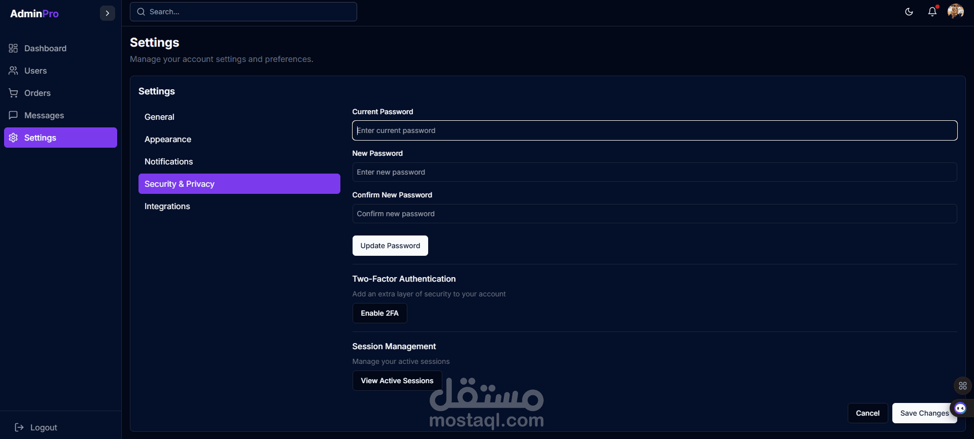 تطبيق ويب متكامل تم تطويره باستخدام React, TypeScript, وVite، يهدف إلى توفير واجهة إدارية حديثة، منظمة، وسريعة الاستجابة لإدارة المستخدمين، الطلبات، الرسائل، والإعدادات. يعتمد المشروع على تصميم نظيف باستخدام Tailwind CSS، ورسوم متحركة سلسة بفضل Framer Motion.
