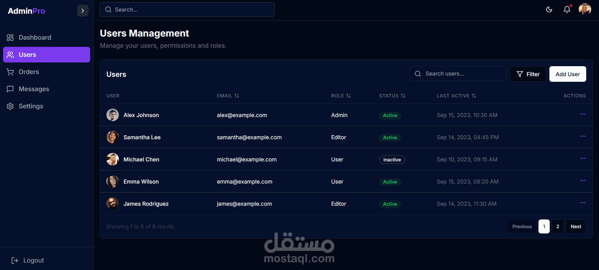 جدول بحث وفرز للمستخدمين حسب الدور والحالة