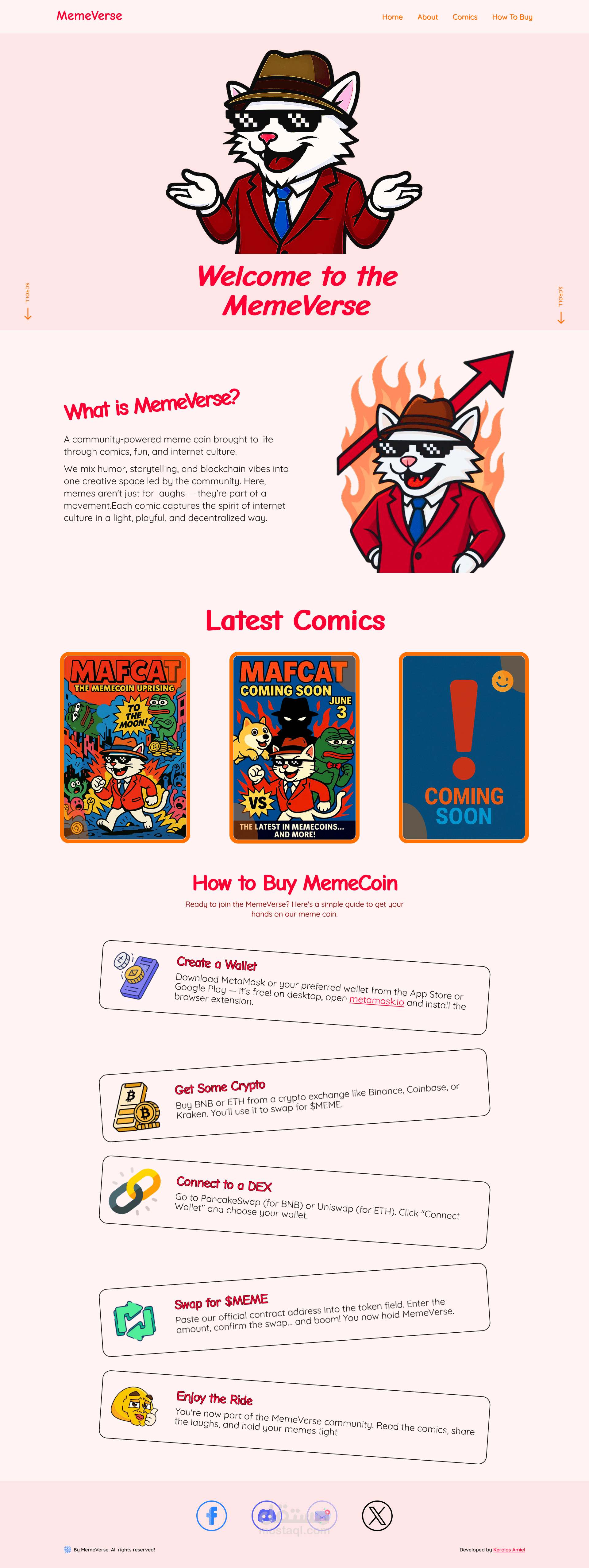 صفحة هبوط تفاعلية ومصممة بأسلوب كوميكس مبهج، تم تنفيذها لعملة ميم رقمية، بالتعاون مع المهندس شريف.
