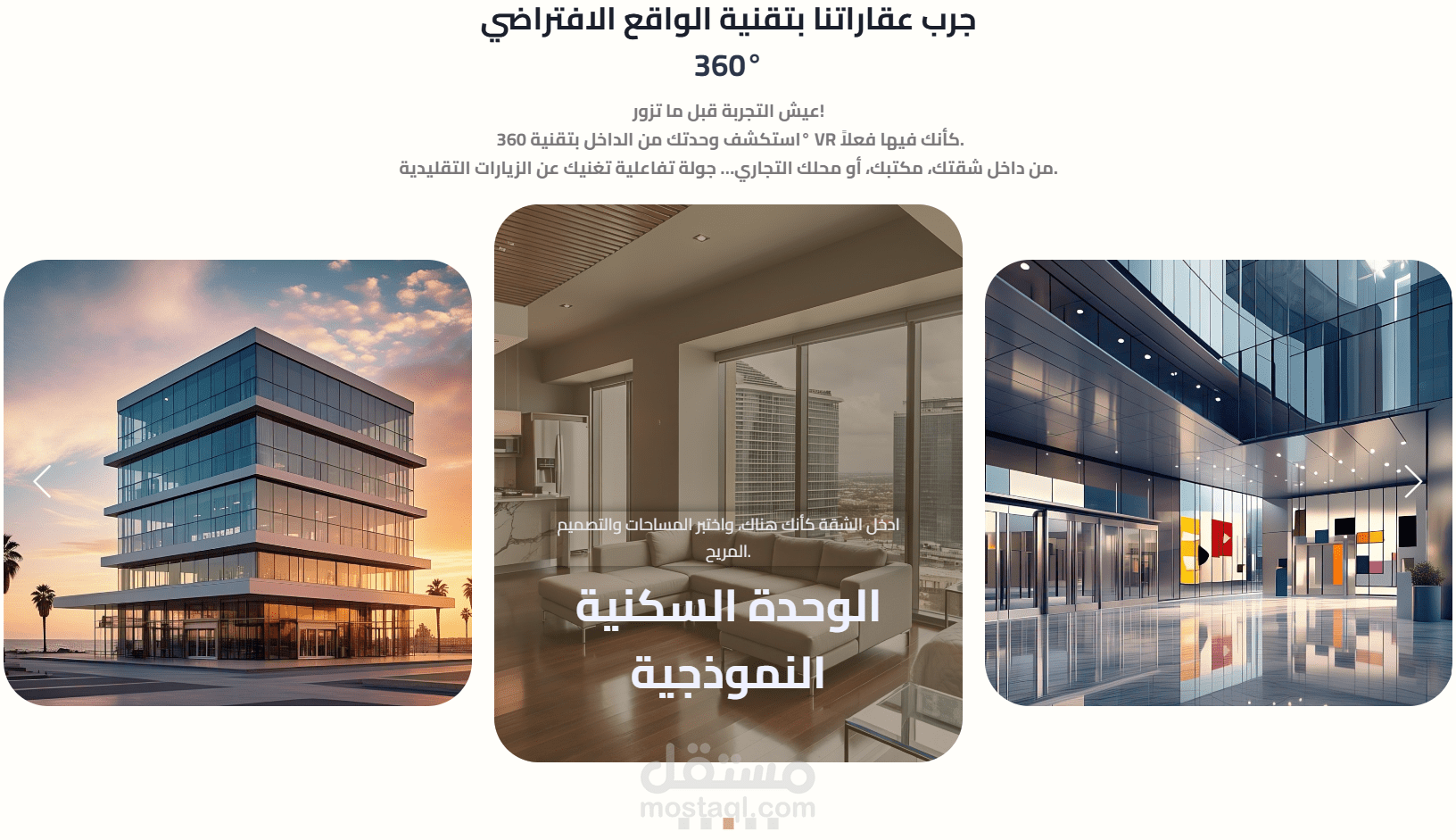 تطوير أقسام متعددة مثل: "من نحن"، "مشاريعنا"، "مشاريع تحت الإنشاء"، و"تصفح بتقنية VR".
