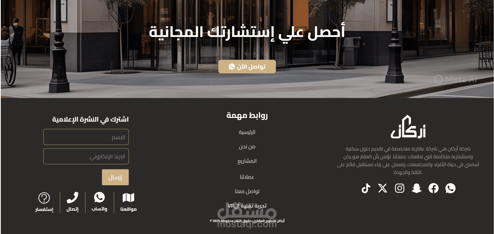 تم تطوير موقع إلكتروني متكامل لشركة "أركان" العقارية باستخدام WordPress و Elementor، مع التركيز على تقديم تجربة مستخدم جذابة وسهلة التنقل، تشمل: