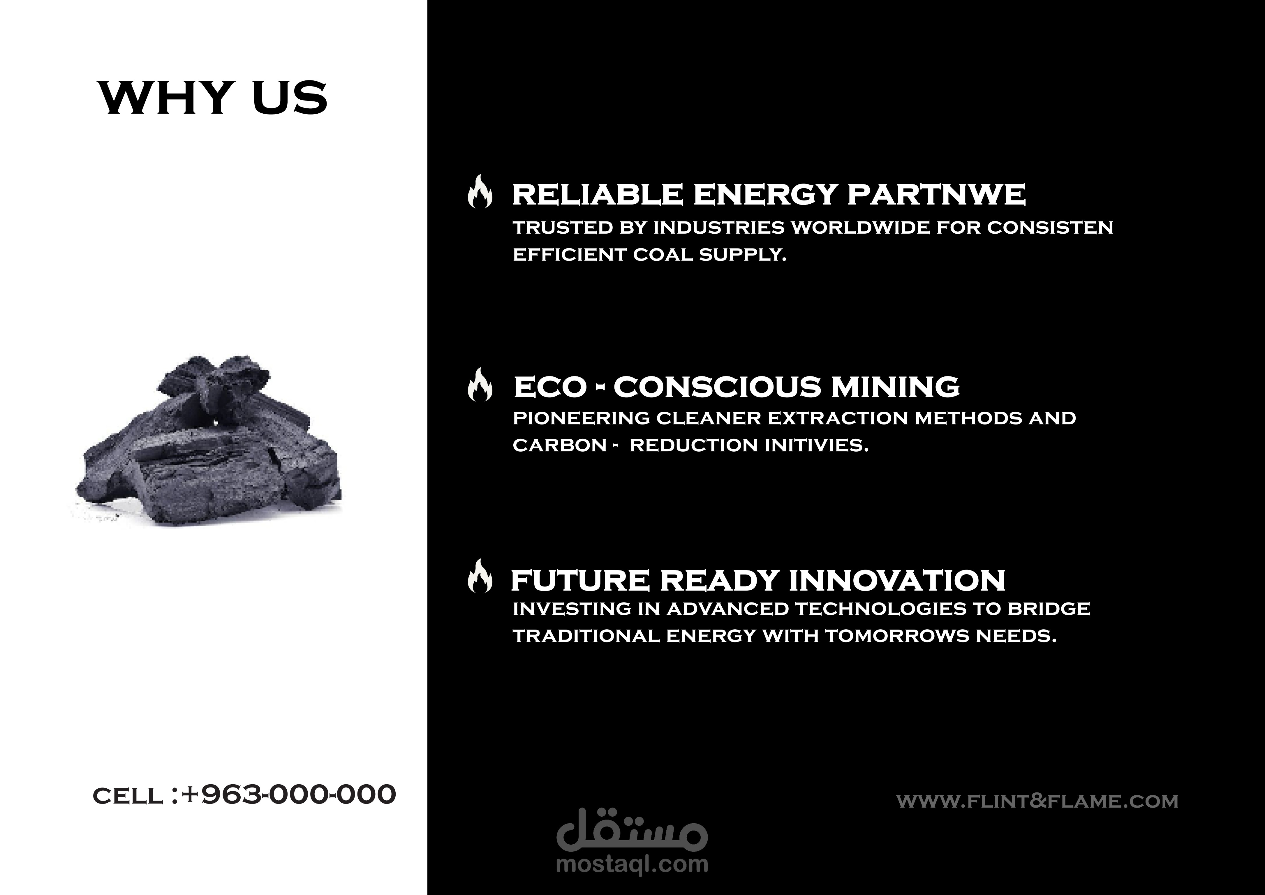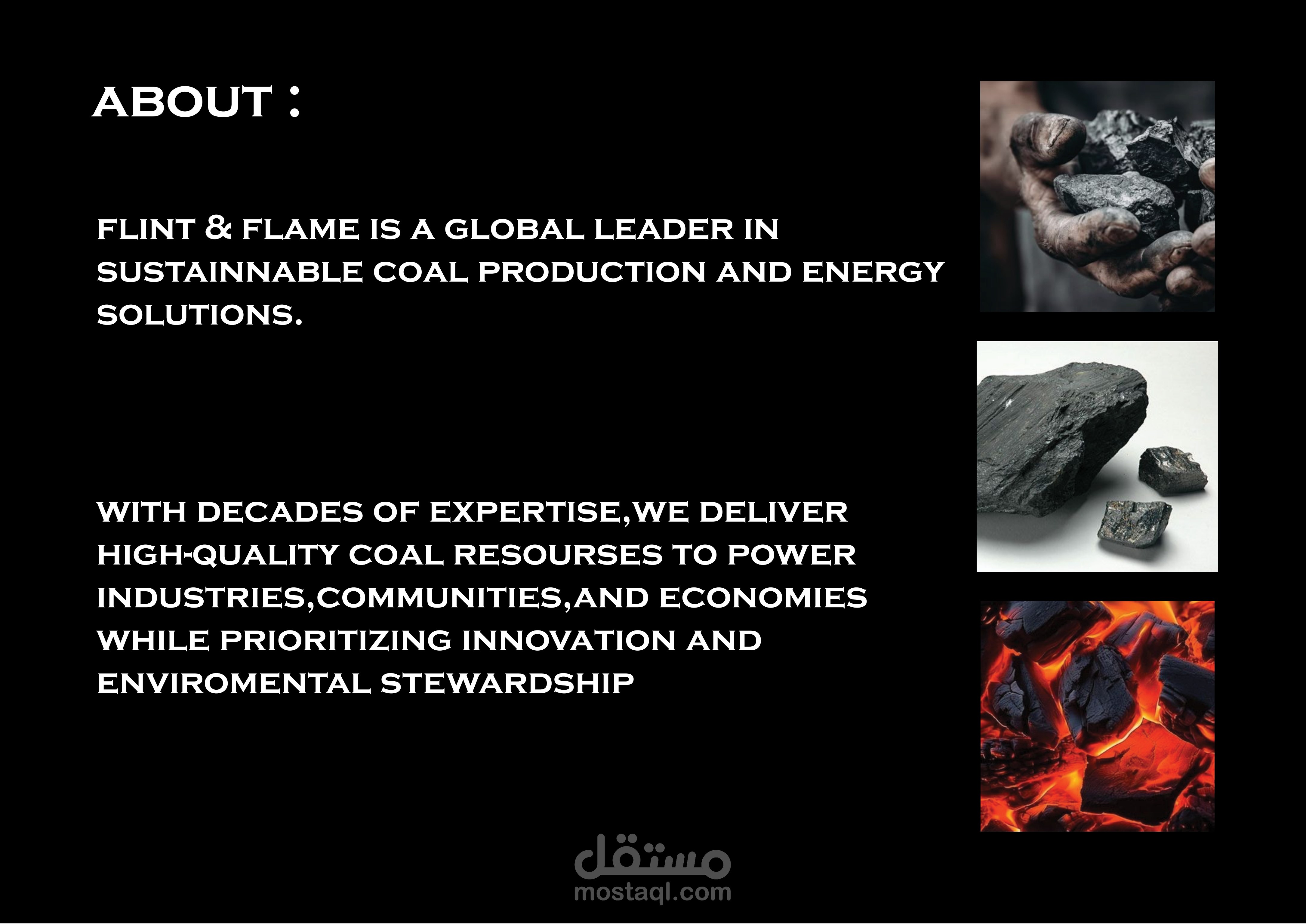 الهوية تجمع بين الحداثة والبساطة، مع لمسة صناعية أنيقة تناسب مجال الفحم والطاقة. جميع العناصر – من الشعار إلى الألوان والطباعة – صممت لتخلق انطباعًا قويًا ومستدامًا، يسهل تذكره ويمنح العلامة حضورًا مميزًا في السوق.