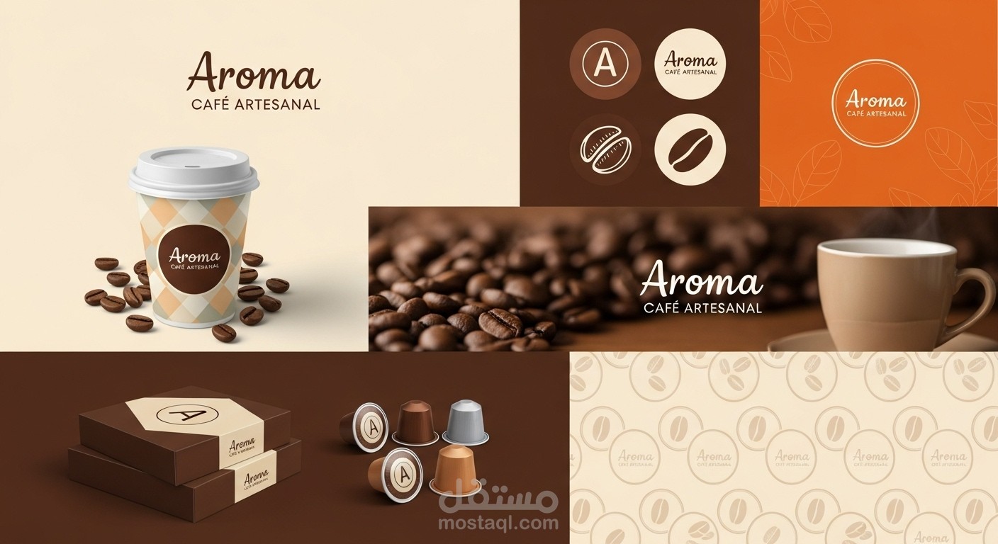 يتم تصميم الهوية بأسلوب يعكس ذوق جمهور المقهى، سواء كان شبابيًا أو فخمًا أو عائليًا، مع استخدام ألوان متناغمة توحي بالدفء والراحة، مثل: