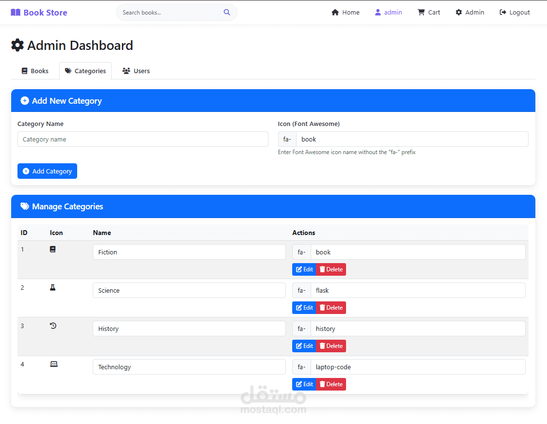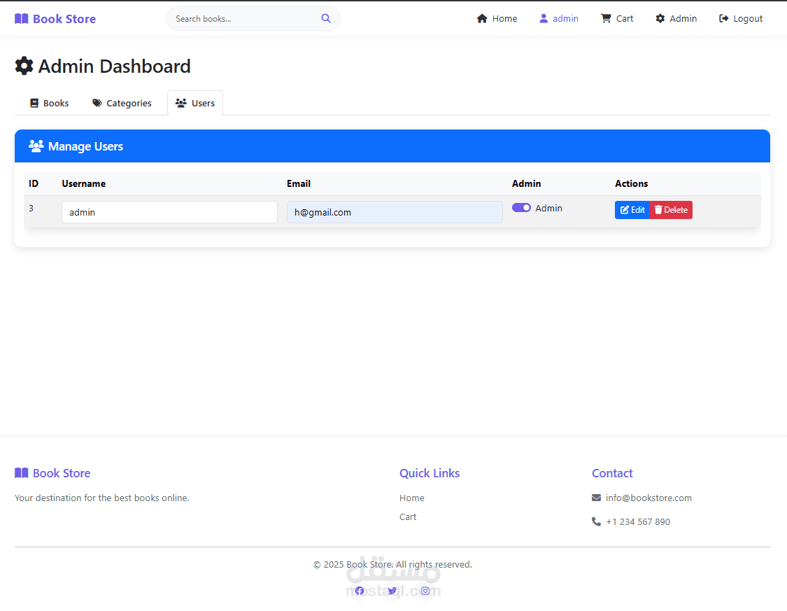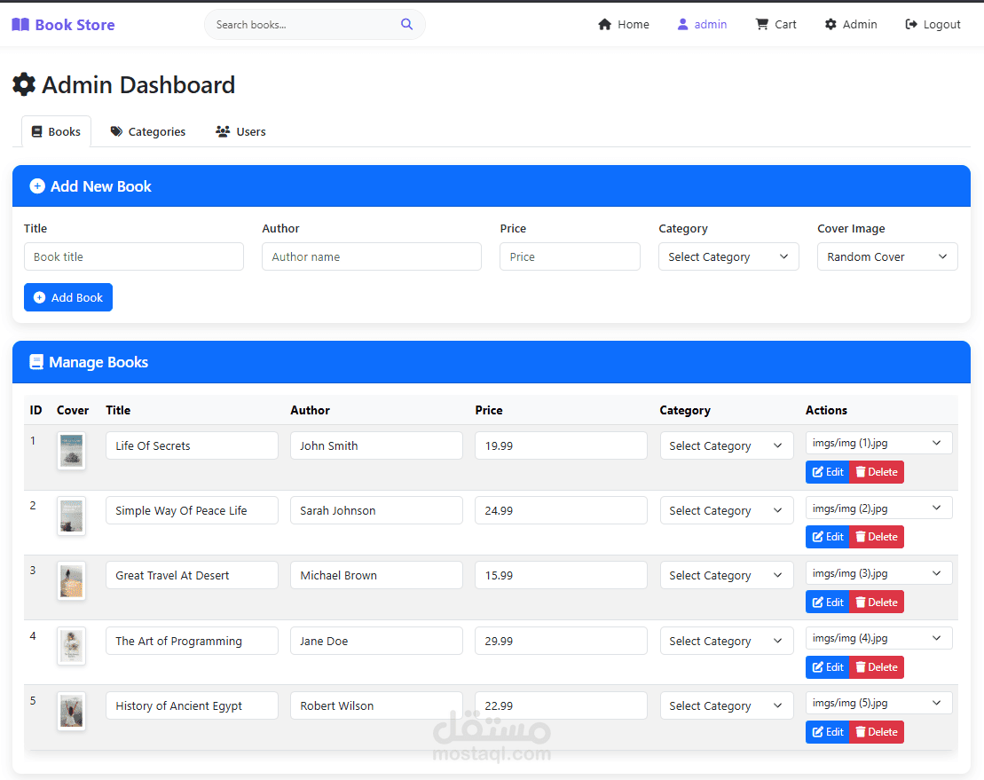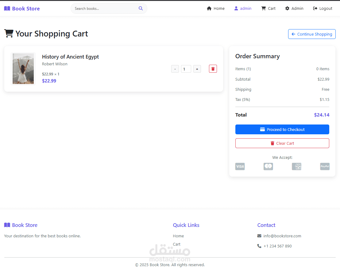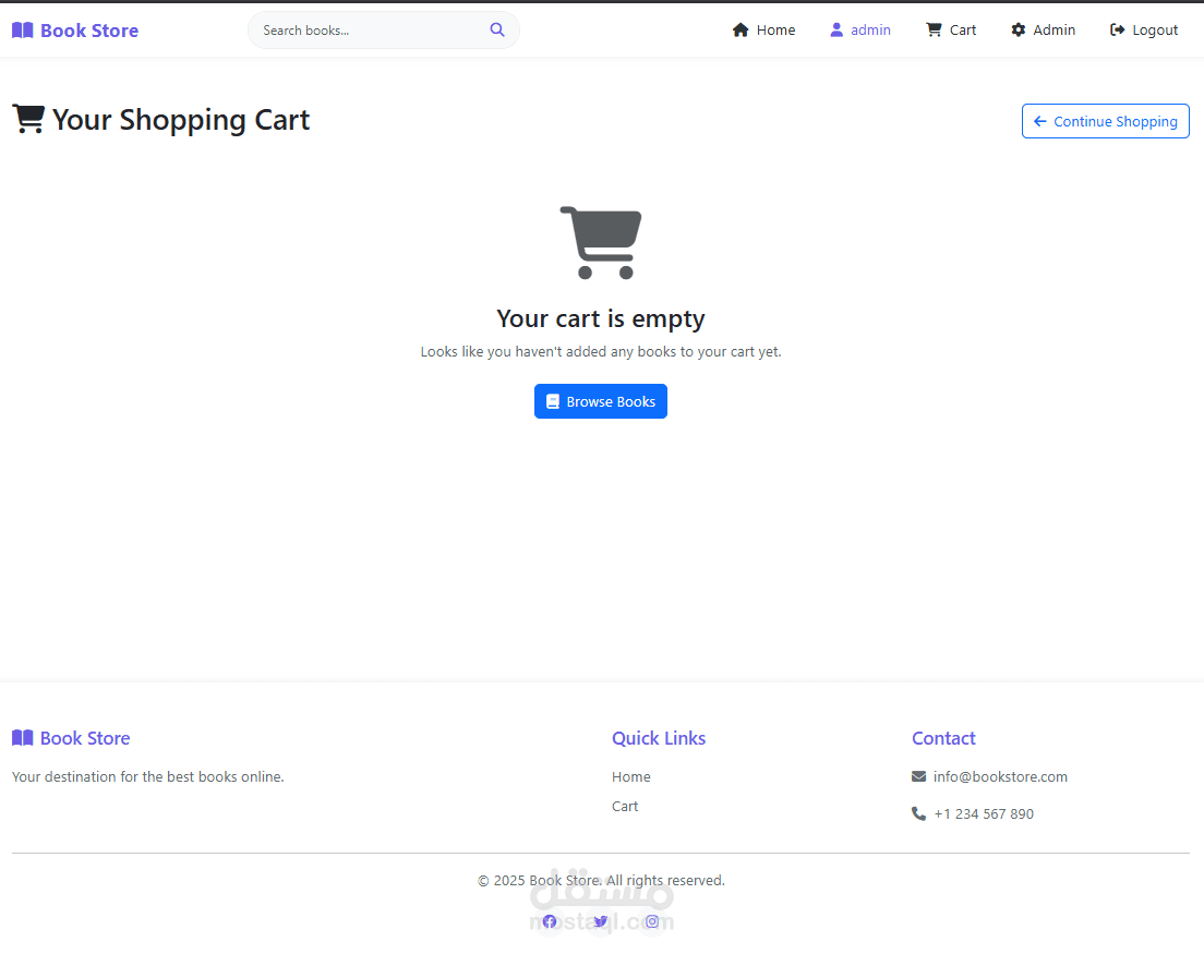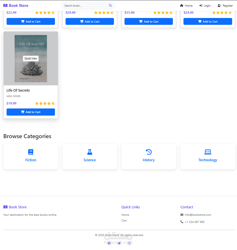 كما يدعم تسجيل الدخول والتسجيل للمستخدمين، ويوفر لوحة تحكم للإدارة لإدارة الكتب، التصنيفات، المستخدمين، والطلبات. يتميز الموقع بواجهة سهلة الاستخدام وإمكانية إدارة جميع بيانات المتجر من خلال لوحة تحكم متكاملة.