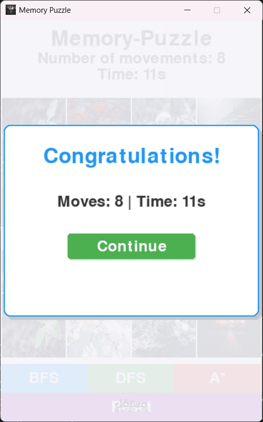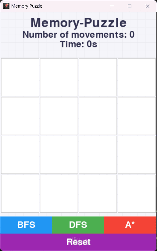 لعبة "Memory Puzzle" هي لعبة ذكاء وتسلية تعتمد على قوة الذاكرة والتركيز. تتكون اللعبة من شبكة من الكروت المغلقة (4 × 4)، كل كارت يحمل صورة، وكل صورة مكررة مرتين. هدف اللاعب هو كشف الكروت والعثور على كل زوجين متطابقين بأقل عدد ممكن من الحركات وفي أسرع وقت.