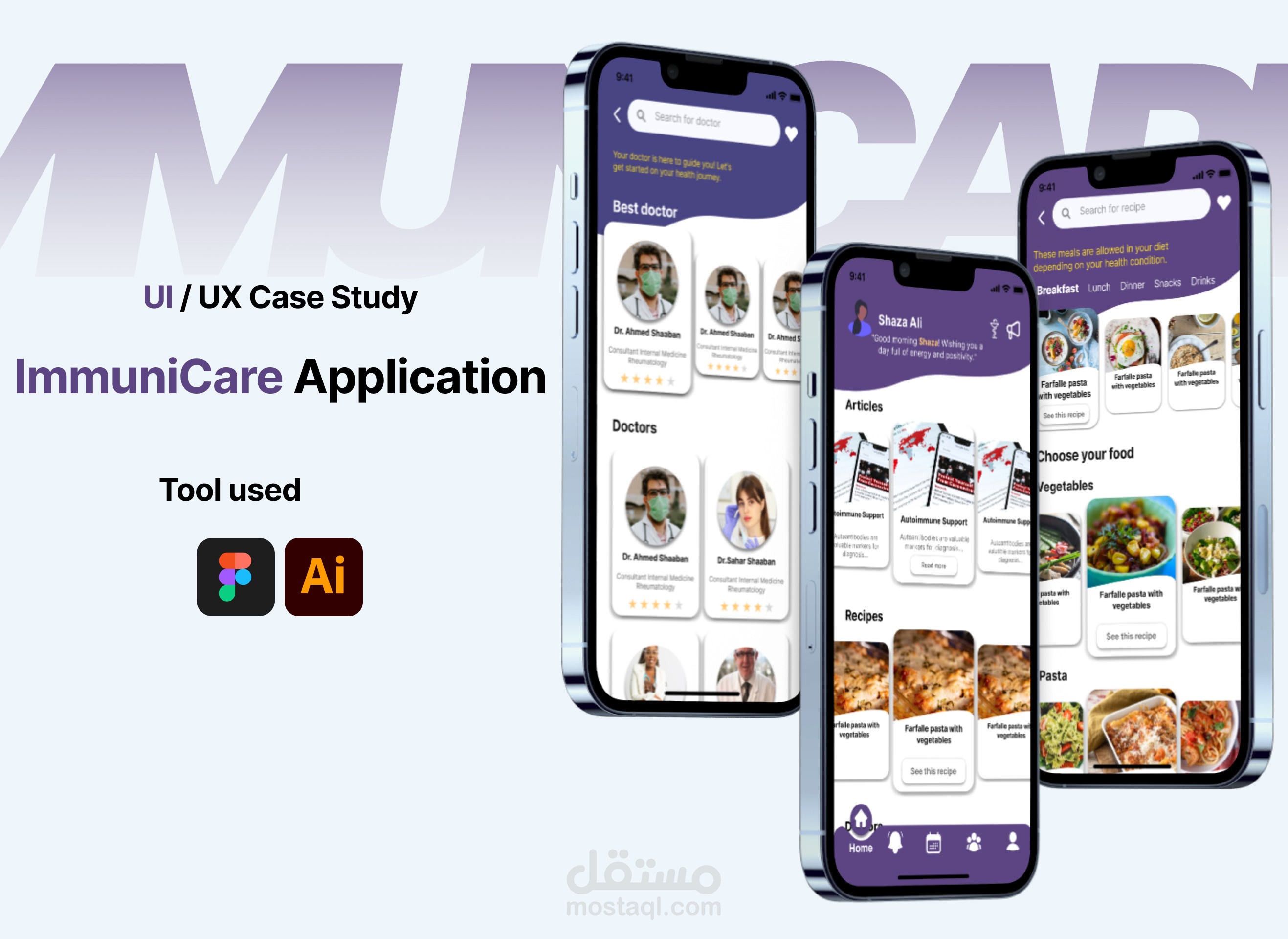 ImmuniCare is an application that simplifies helps people to know more about the disease through articles in the application, alerts about the time of medication and the doctor's appointment, adherence to a healthy diet that suits each patient according to his health condition and receiving psychological support because this makes a difference in the psychology of autoimmune patients.