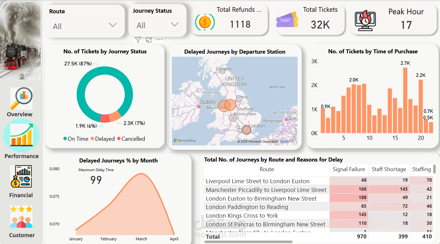 في هذا المشروع، قمت بتصميم لوحة معلومات تفاعلية شاملة باستخدام Power BI تهدف إلى تحويل البيانات الخام إلى رؤى تحليلية واضحة تدعم اتخاذ قرارات استراتيجية في قطاع النقل. وقد شملت عملية التحليل عدة محاور رئيسية، نوضحها كما يلي: