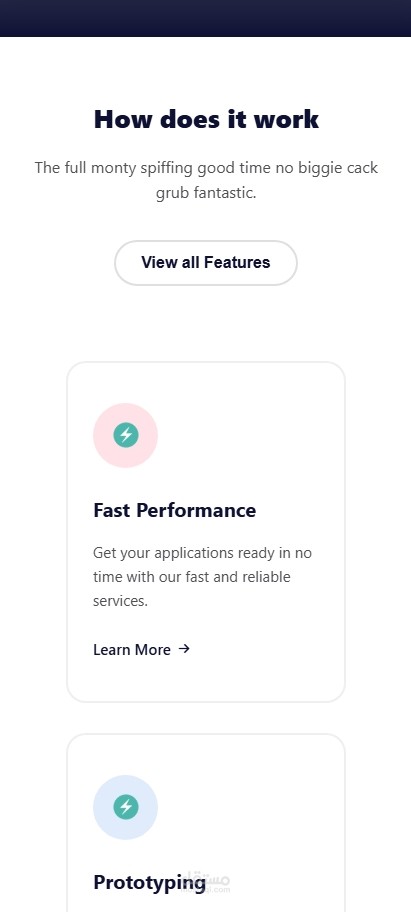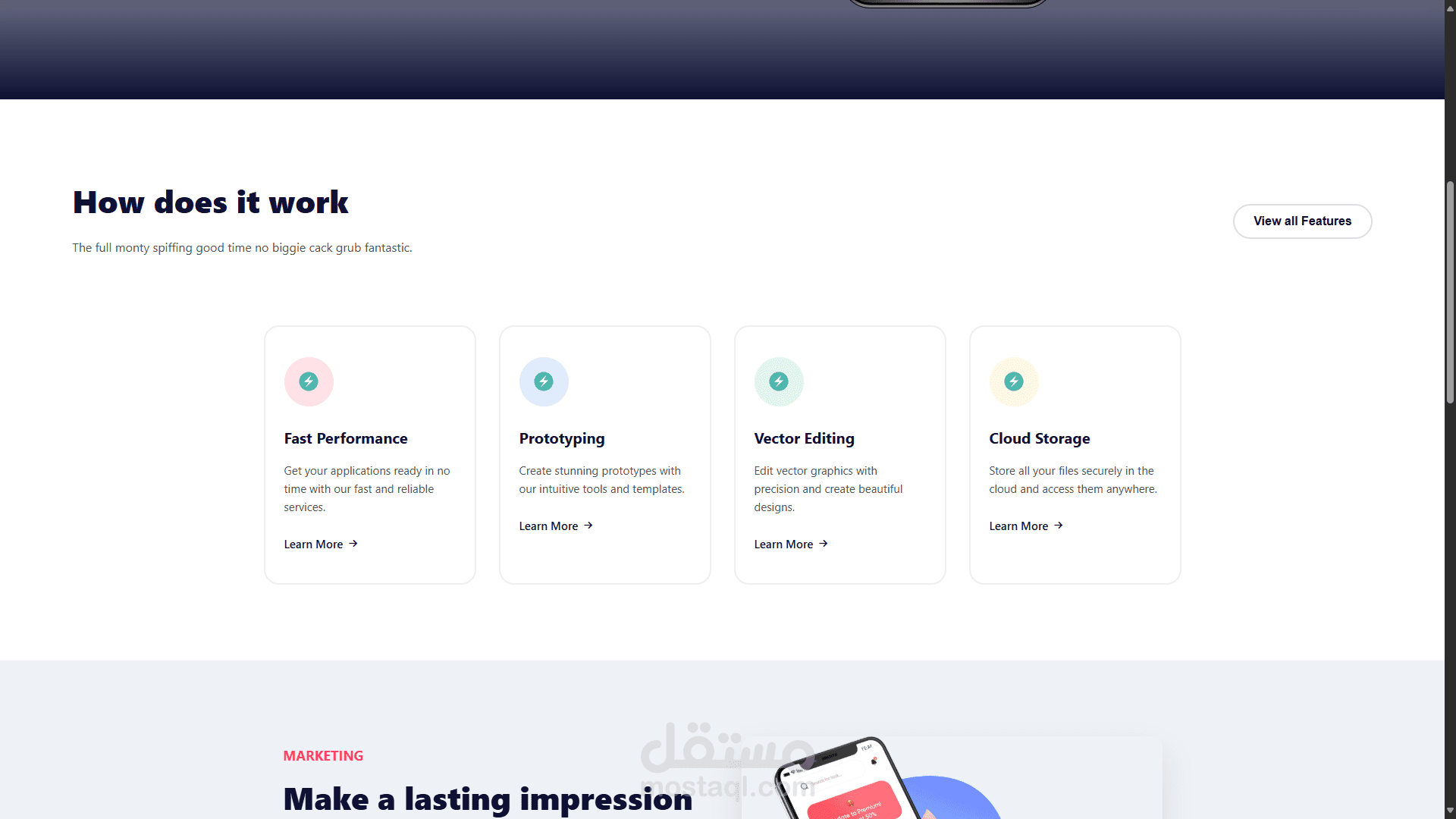 Features Section: عرض 4 مميزات أساسية (الأداء السريع، النماذج الأولية، تحرير الفيكتور، التخزين السحابي)