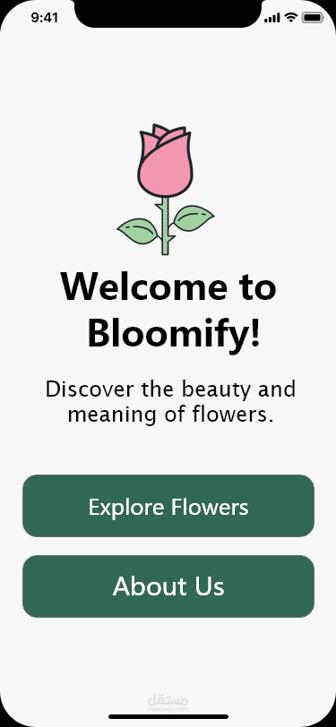 شاشة ترحيب: تضم شعار التطبيق ورسالة تعريفية تدعو المستخدم لاختيار «استكشاف الزهور» أو «من نحن»