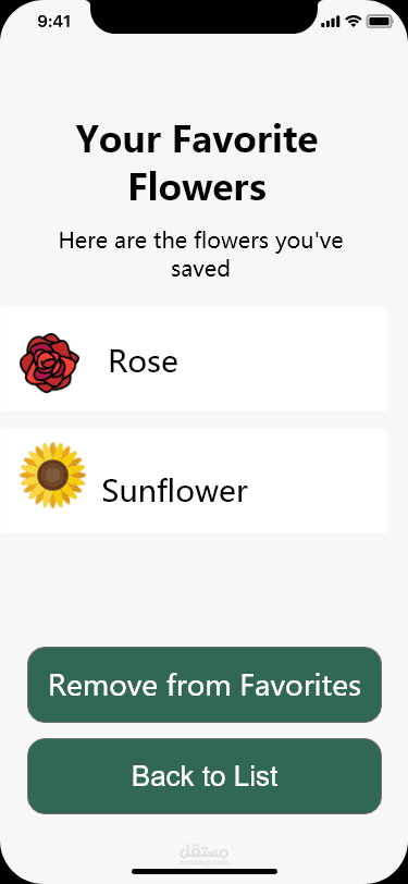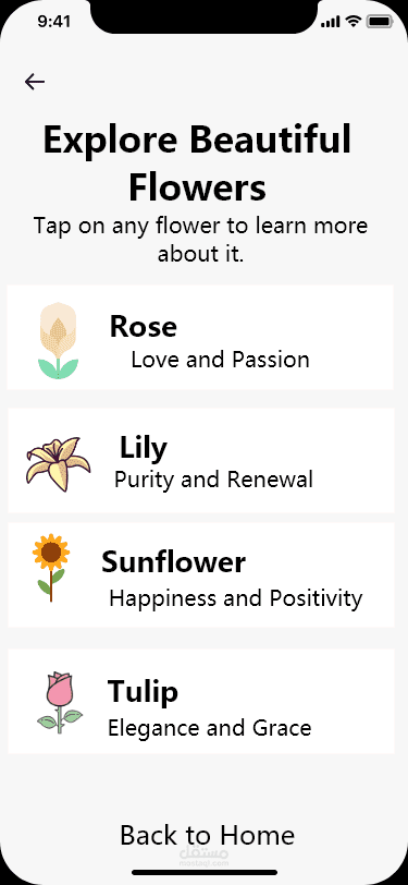 شاشة استكشاف الزهور: قائمة بأنواع الزهور (ورد، زنبق، عباد شمس، توليب) مصحوبة بأيقونات مميزة ونبذة قصيرة عن كل زهرة