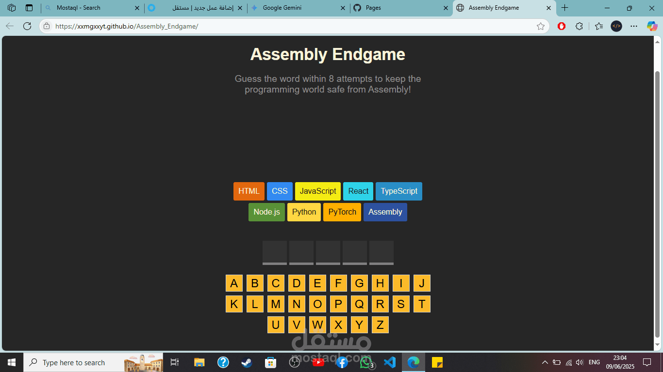 قمت بتطوير لعبة "Assembly Endgame"، وهي لعبة تخمين كلمات تفاعلية ومسلية، باستخدام مكتبة React JS القوية. تركز هذه اللعبة على اختبار معرفة المستخدم بمصطلحات البرمجة والتكنولوجيا، حيث يهدف اللاعب إلى تخمين الكلمة الصحيحة في غضون 8 محاولات للحفاظ على "عالم البرمجة آمنًا من Assembly!"، مما يضيف لمسة فكاهية ومبتكرة.