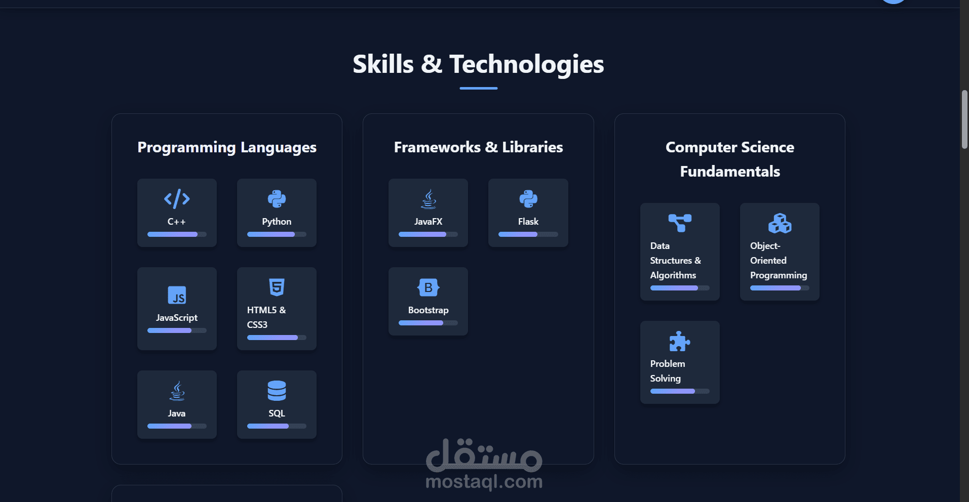* **المهارات**: عرض المهارات مع نسب الإتقان بشكل بصري جذاب