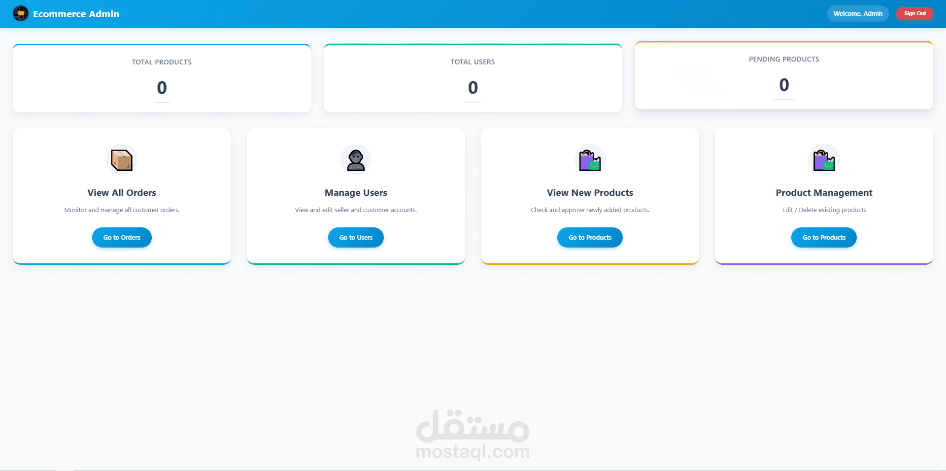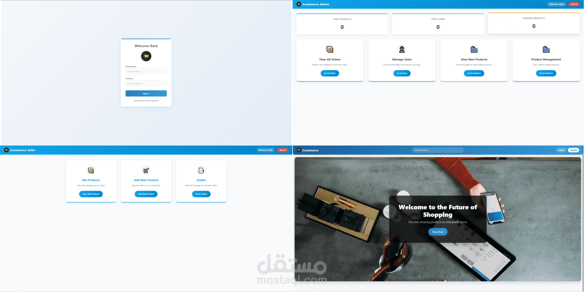 قمت بتطوير تطبيق ويب متكامل للتجارة الإلكترونية باستخدام HTML وCSS وJavaScript (بدون أي إطار عمل)، ويتميز بوجود أربع صلاحيات مختلفة للمستخدمين: المسؤول (Admin)، البائع (Seller)، العميل (Customer)، والزائر (Guest).