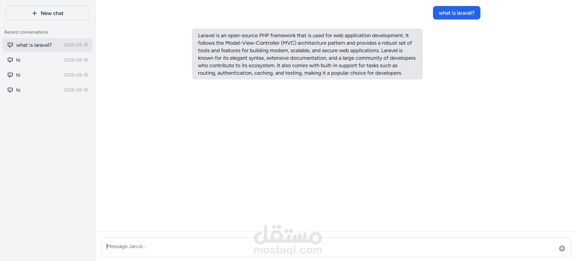 Jarvix is an AI-powered chat application built using Laravel, Vue.js, and Alpine.js, integrating OpenAI's API for dynamic, intelligent conversations. Users can save chats, continue previous conversations, and enjoy a sleek, responsive UI.