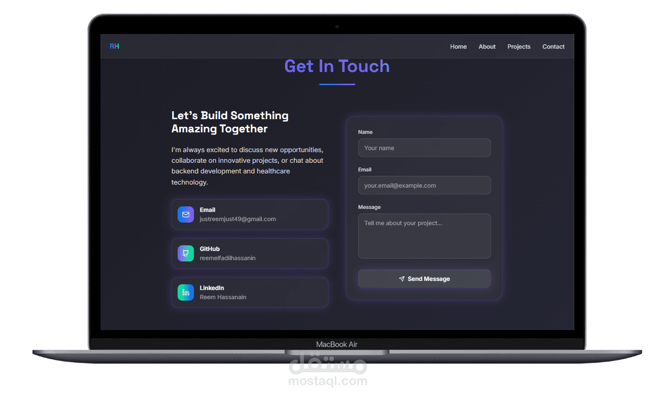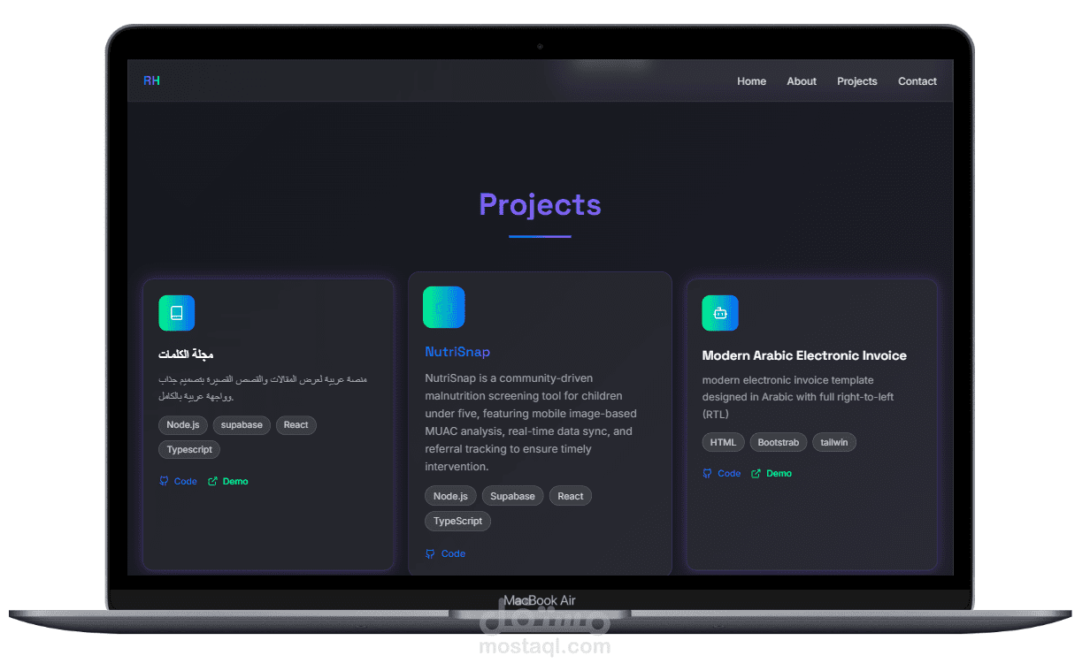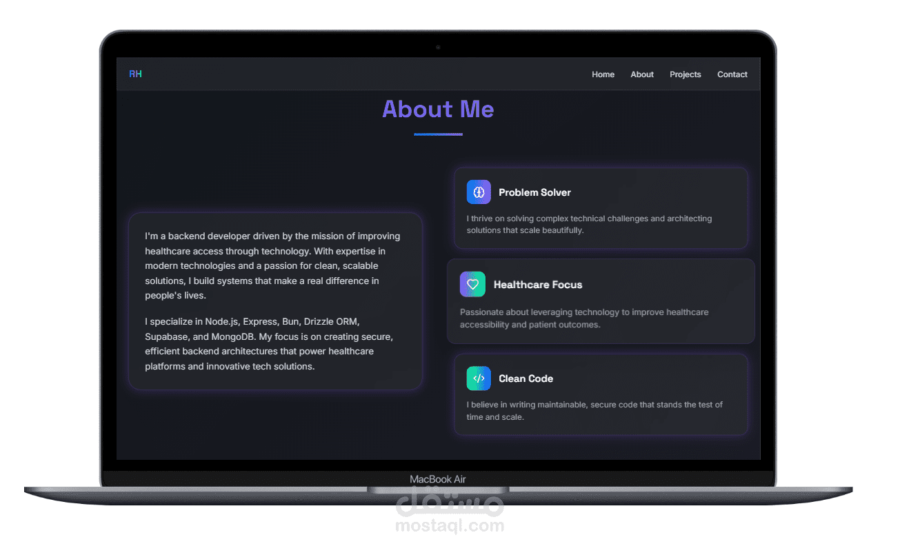 أقسام مرتبة: نبذة عني، المشاريع، المهارات، والتواصل.