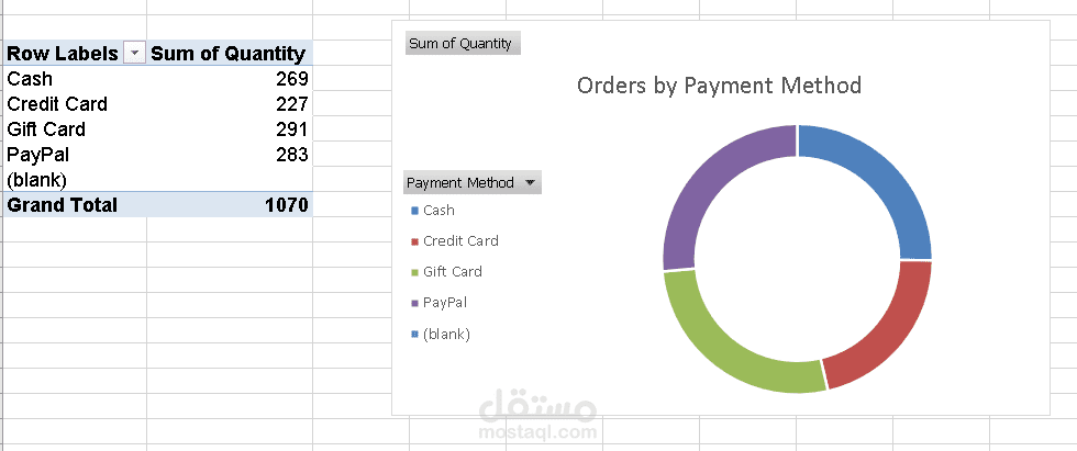 طرق الدفع: "بطاقات الهدايا" (Gift Card) و"الدفع النقدي" (Cash) هما الأكثر استخدامًا من حيث عدد الطلبات.