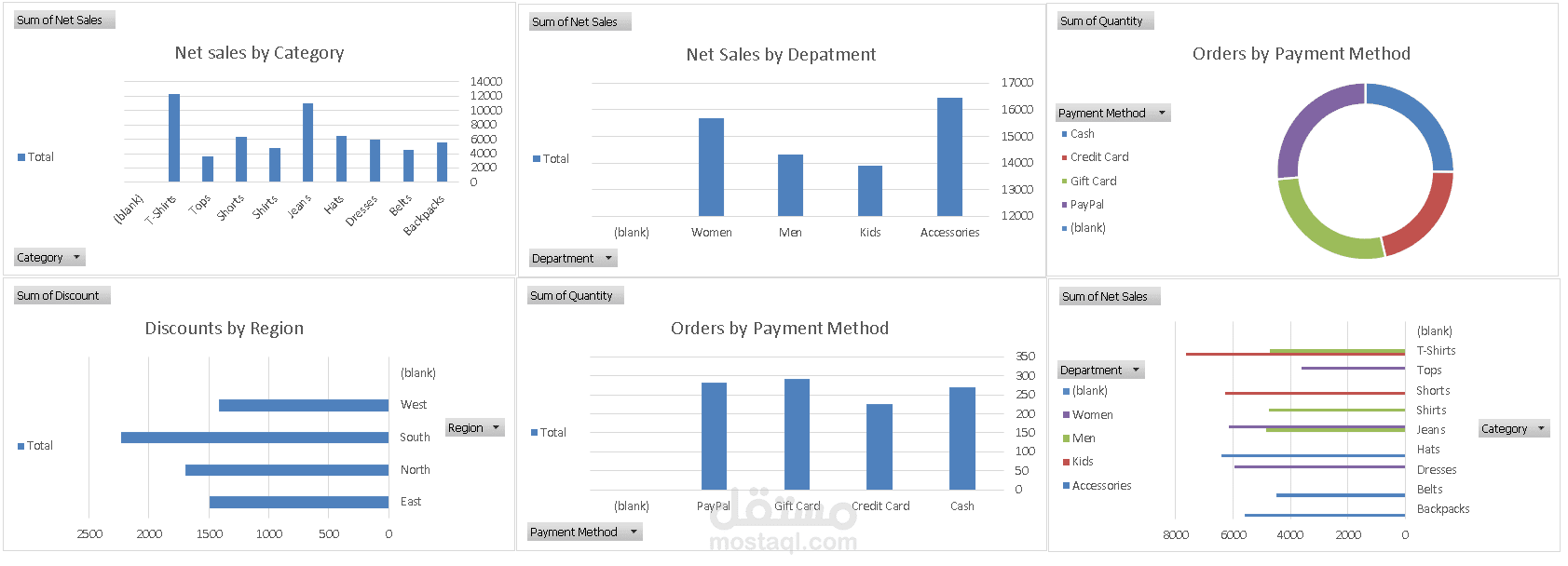 الأكثر مبيعًا: فئتا "القمصان" (T-Shirts) و"الجينز" (Jeans) هما الأعلى مبيعًا، وقسم "الإكسسوارات" يليه قسم "النساء" هما الأكثر تحقيقًا للإيرادات.